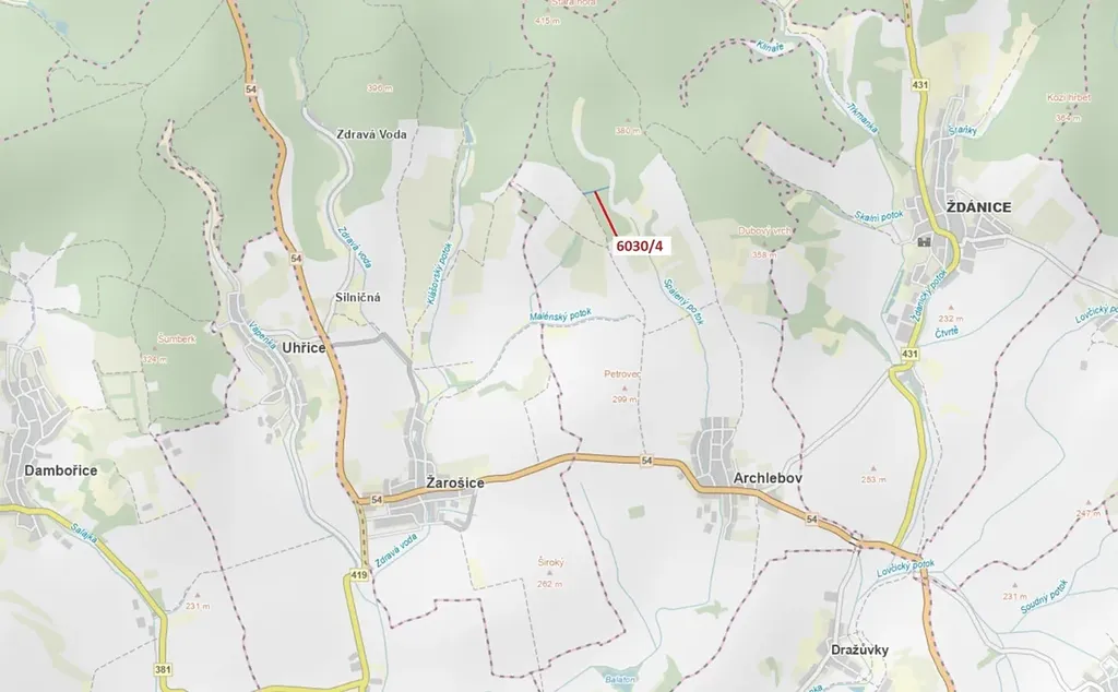 Lesní pozemek o výměře 2108 m2, parcelní číslo 6030/4, podíl 1/1, katastrální území Archlebov, obec Archlebov, obec s rozšířenou působností Kyjov, okres Hodonín, Jihomoravský kraj. Po těžbě.