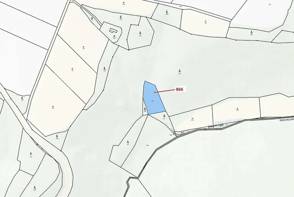 Ostatní plocha o výměře 1277 m2, parcelní číslo 866, podíl 1/1, katastrální území Malý Dešov, obec Dešov, obec s rozšířenou působností Moravské Budějovice, okres Třebíč, Kraj Vysočina.