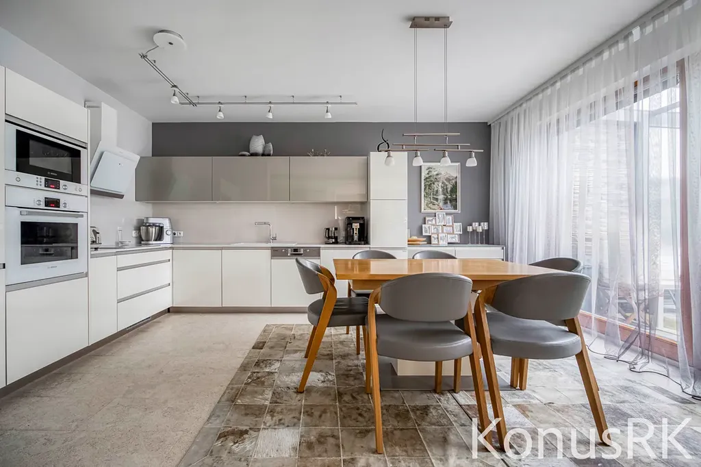 Kuchyně je řešena na míru renomovanou firmou Sýkora a osazena vestavěnými elektrospotřebiči značky Bosch, což uspokojí i náročnější uživatele. Celkový prostor kuchyně a jídelny plynule navazuje na obývací část.