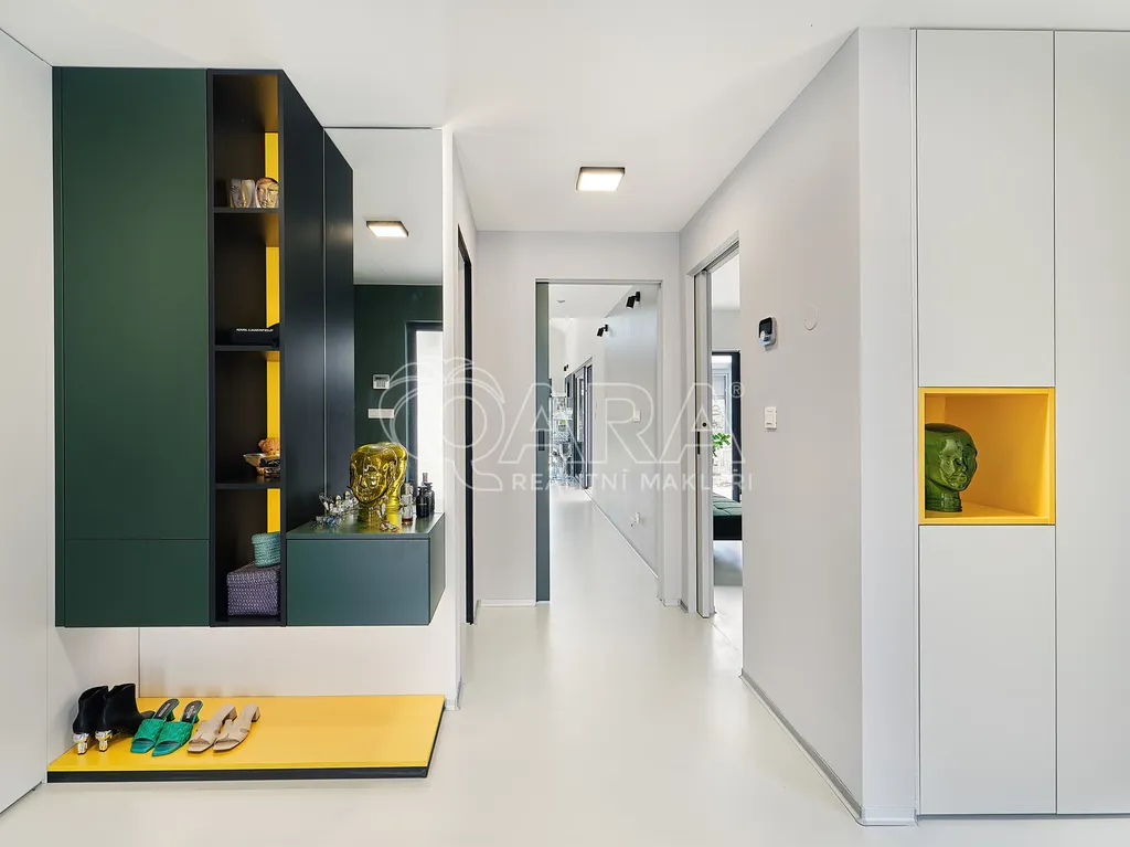 Zprostředkujeme Vám ke koupi moderní, reprezentativní, designový, maximálně funkční vilový bungalov (dřevostavba) s obytnou plochou 145 m2, se zimní a architektonickou zahradou, situovaný v nejprestižnější části Kamenice – Štiřín, v klidové zóně u zámku a golfového hřiště. Tento výjimečný dům je vystavěn na pozemku o celkové ploše 1 205 m2 a byl kolaudován v roce 2023. Dominantou stavby je originální ručně malovaná fasáda od akademického malíře, která domu dodává naprosto jedinečný charakter a činí jej skutečným designovým originálem. Parcela je bez přímých sousedů, vzrostlé stromy vytvářejí přirozené soukromí i mikroklima – ráno vás probudí ticho a zeleň, večer si užíváte jemně nasvícenou zahradu místo pohledů do cizích oken.