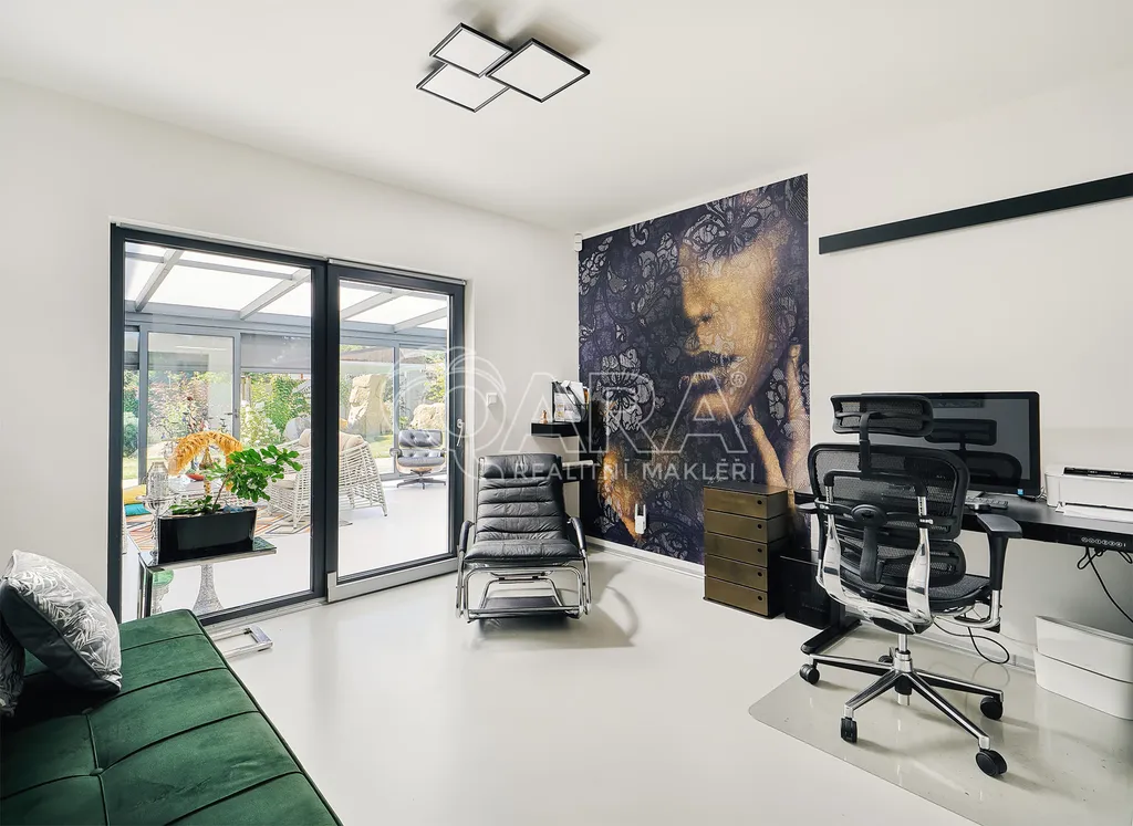 Celoroční využití (jídelna / relaxační zóna), podlahové vytápění, přímý vstup na zahradu, dálkově ovládané stínění ISOTRA