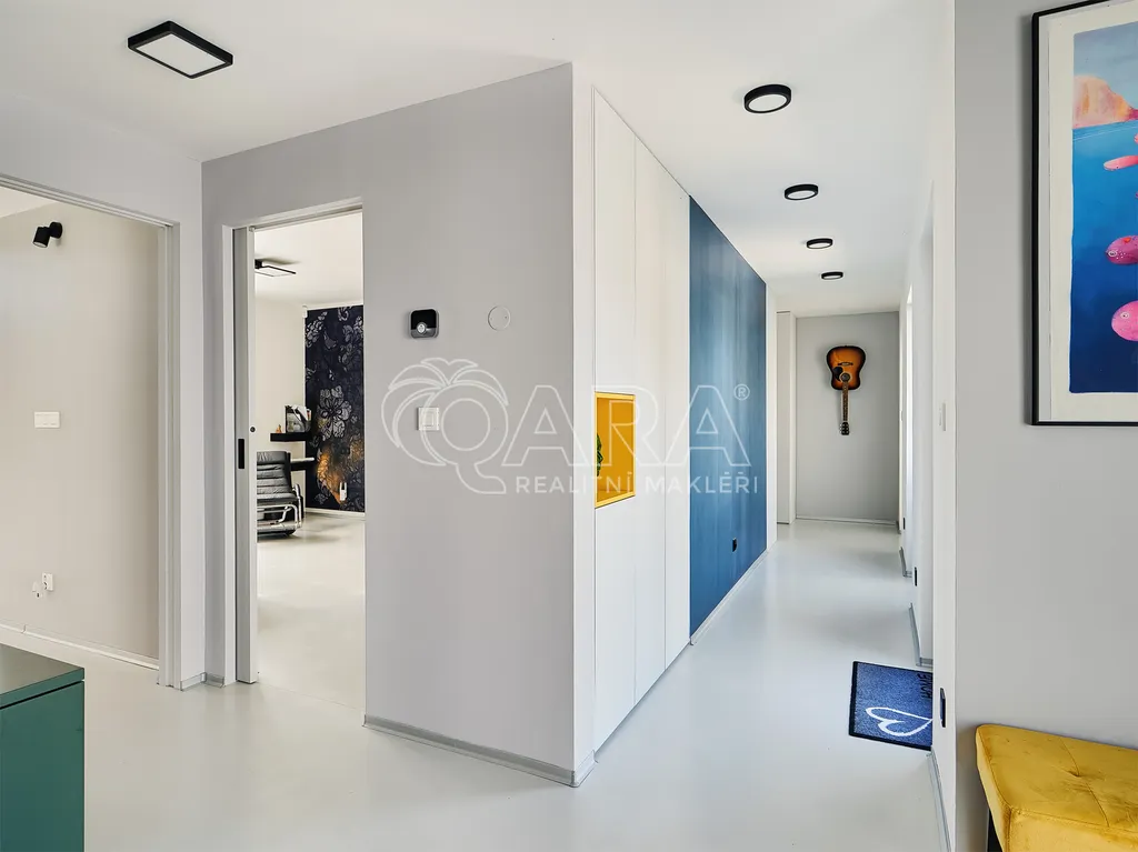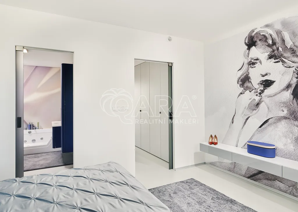 Použity jsou prémiové designové tapety Glamora – ruční italská výroba patřící ke světové špičce, nabízejí vysokou odolnost, jedinečný vzhled a nadčasovou eleganci. Nábytek na míru od firmy HANÁK, bezfalcové dveře a KARE desing. Celkový koncept interiéru je moderní, čistý a harmonický.