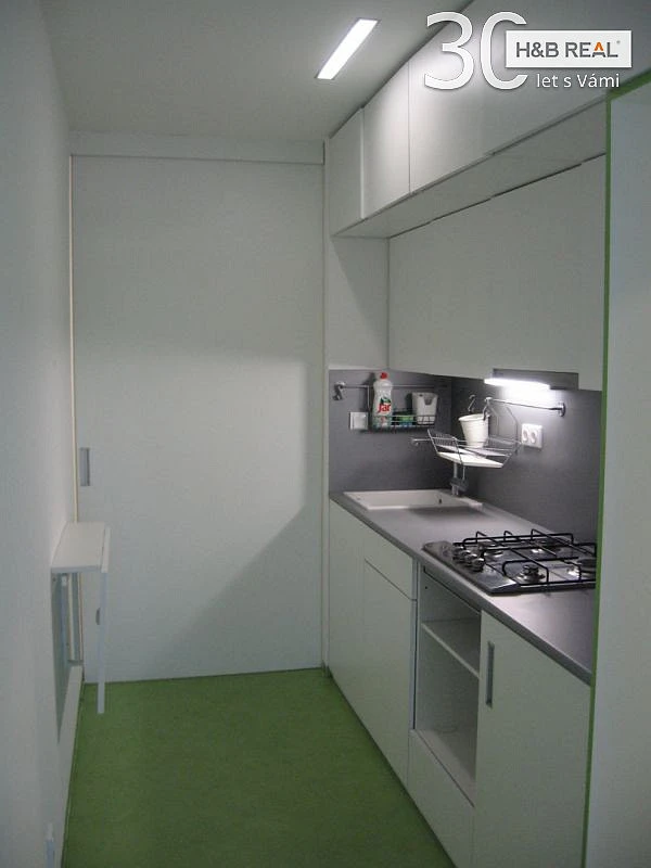Je zde moderní koupelna se sprchovým koutem, kuchyňská linka s plynovým sporákem, přípravou na myčku, elektrickou troubu a mikrovlnku. Naproti lince je chytře vyřešen sklápěcí jídelní stolek, který je připevněný ke zdi a je možné jej jednoduše sklopit. Netradičně jsou řešeny i úložné prostory – sestava skříněk a polic, která prostorově odděluje kuchyňskou a obytnou část bytu. Pokud by toto řešení nevyhovovalo, tak ji lze jednoduše demontovat. Podlahy jsou z PVC, pod stropem jsou sádrokartonové podhledy.