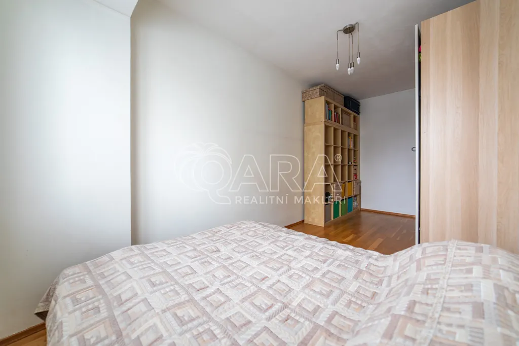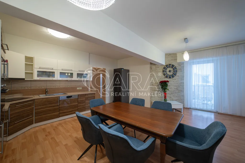 Dominantou bytu je prostorný obývací pokoj přes 45 m2, který je spojený s kuchyňským koutem. Kuchyňská linka je kompletně vybavená vestavěnými spotřebiči. Koupelna a toaleta jsou samostatně přístupné. Pokoje nejsou průchozí. V předsíni se také nachází komora ( šatna) a velká vestavěná skříň.