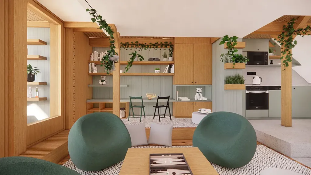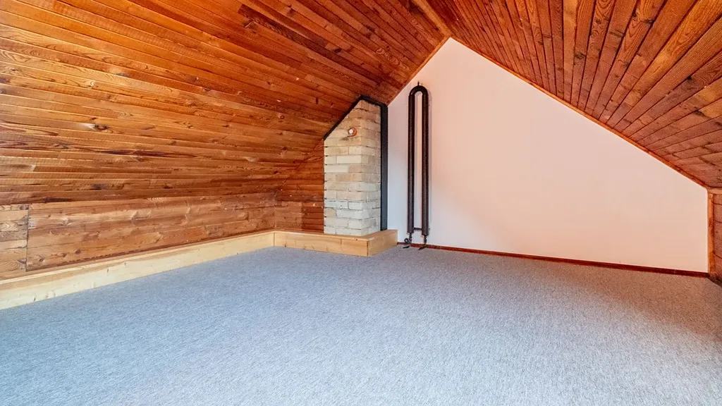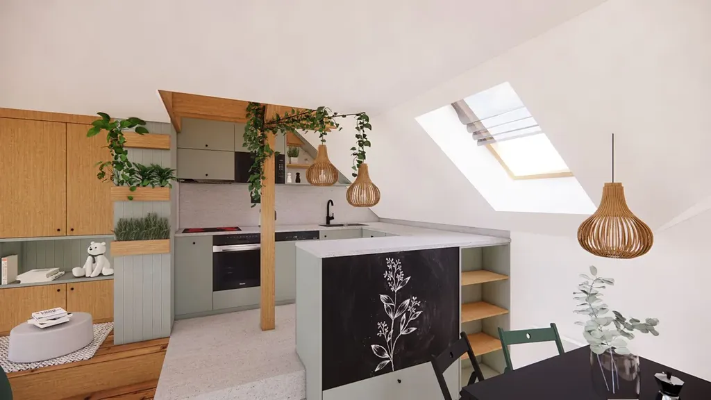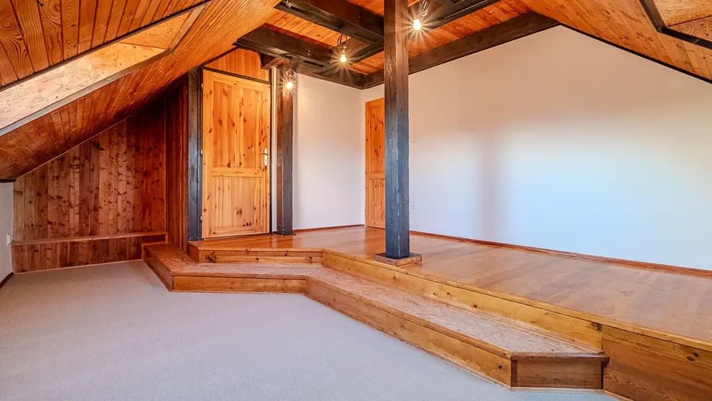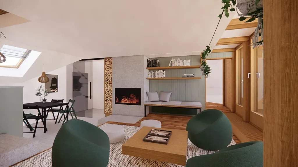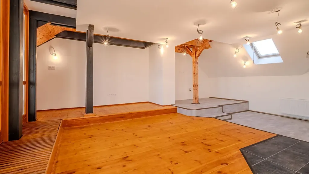 Celý byt je charakteristický krásnými přiznanými dřevěnými trámy, obložením a krovy, které vytváří útulný dojem.