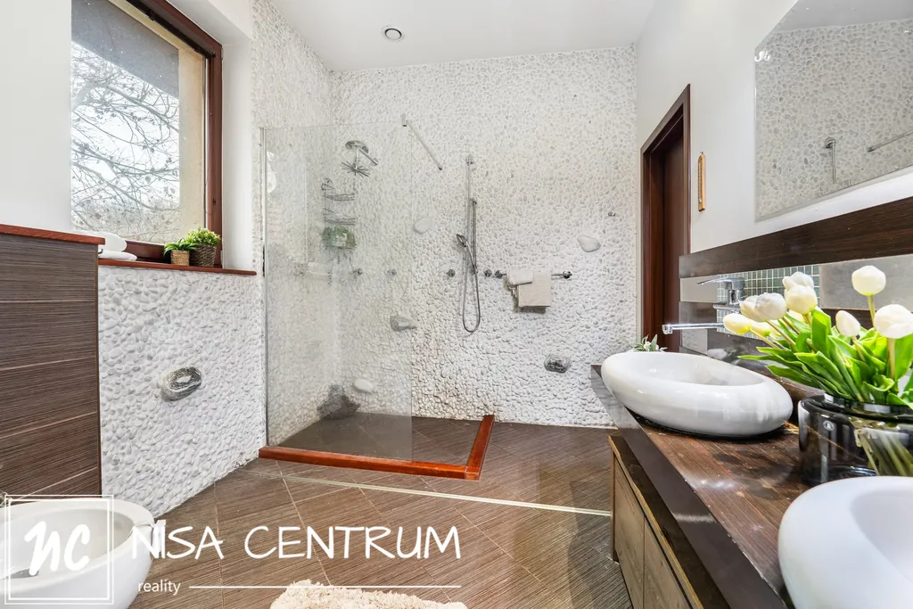Dům nabízí čtyři koupelny, krb v obývacím pokoji i v ložnici, internet po celém domě, satelit a kamerový systém kolem celého domu. Součástí je také nábytek na zakázku a udržovaná zahrada, která podtrhuje komfort a soukromí celého bydlení.