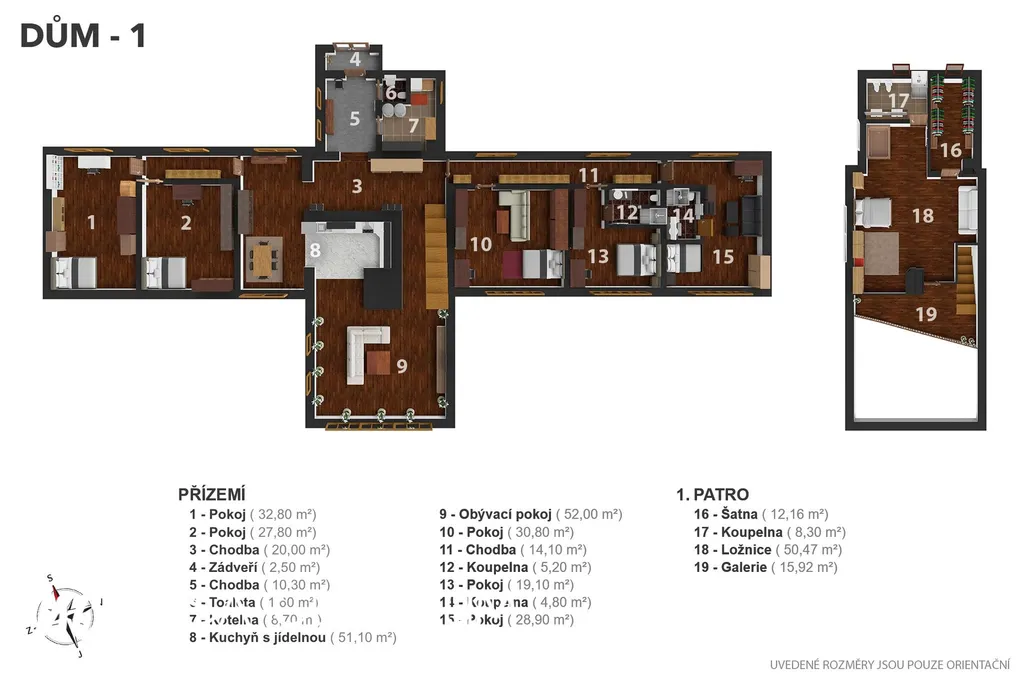 Dominantou je hlavní dům o dispozici 7+1 s užitnou plochou 430 m². Vytápění je řešeno tepelným čerpadlem a podlahovým topením, v koupelnách jsou žebříky a místy doplněné radiátory.