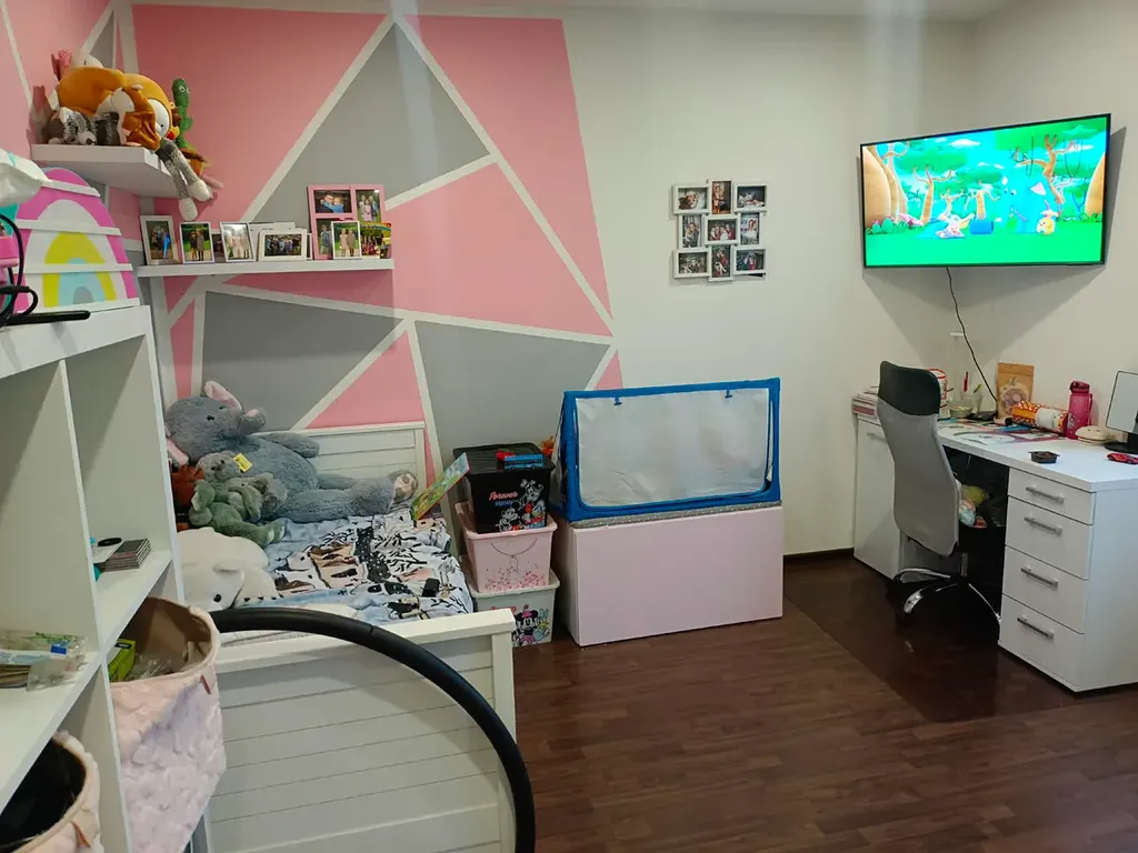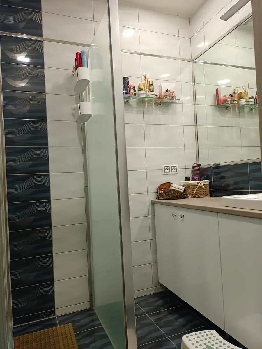 Dispozice bytu, o užitné ploše 62 m², v osobním vlastnictví, byla změněna na prostornou chodbu s úložným prostorem, ze které se dostaneme po pravé straně do komory, koupelny a wc, po levé straně do ložnice a dětského pokoje, na konci chodby prostorný obývací pokoj s kuchyňským koutem.