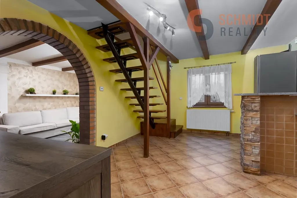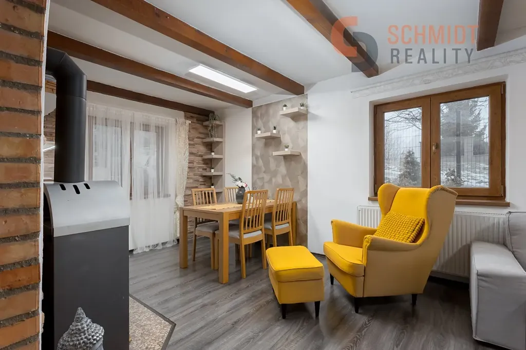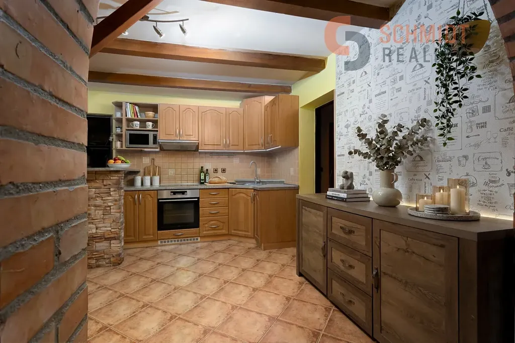 - Vytápění domu zajišťuje elektrický kotel napojený na radiátory, doplněný o krbová kamna,