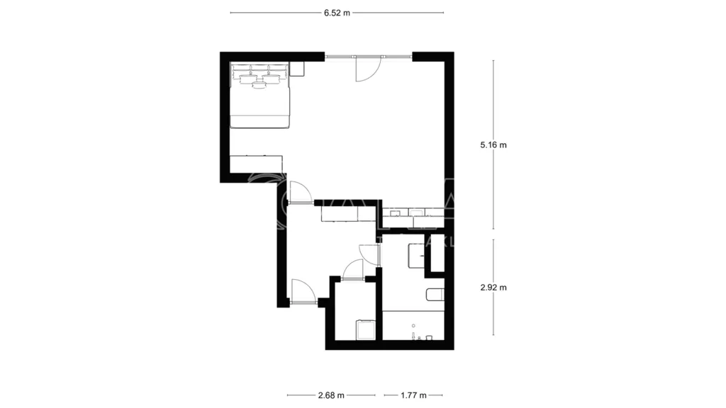 Hlavní obytný prostor o velikosti 27 m² je vybaven kuchyňskou linkou s moderními elektrospotřebiči (lednička, indukční vařič, digestoř).