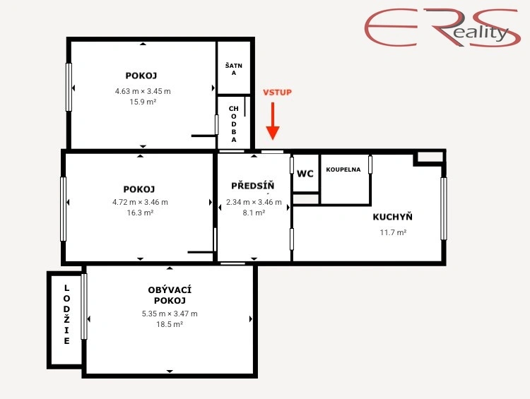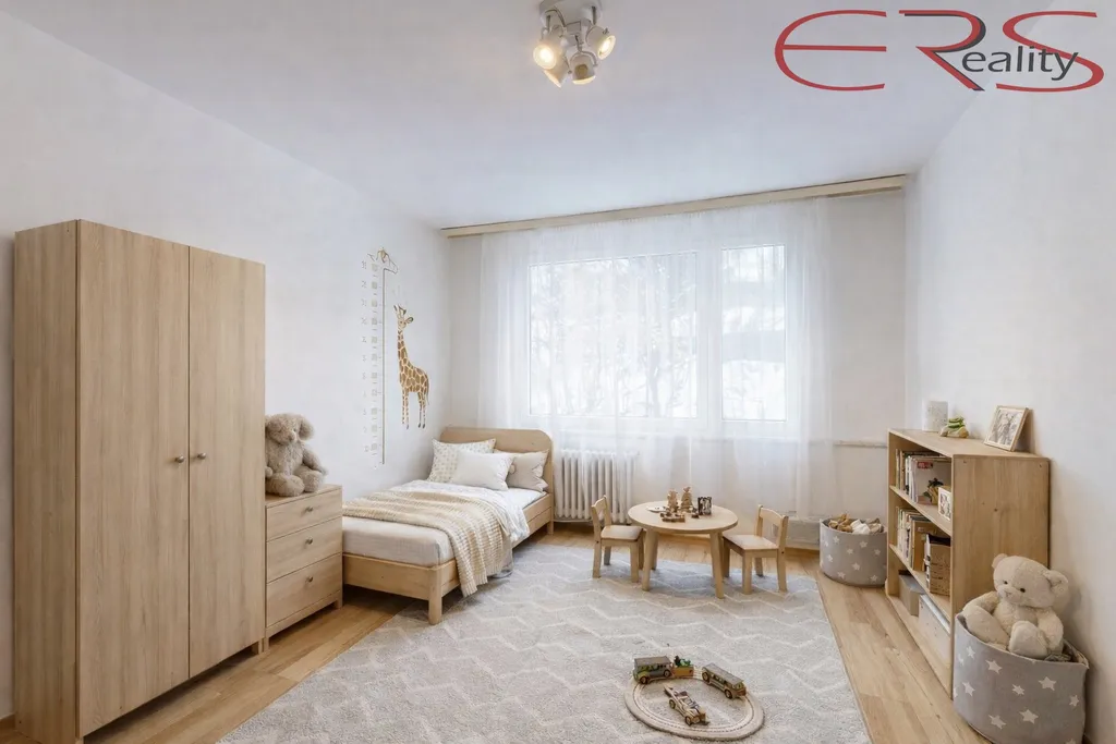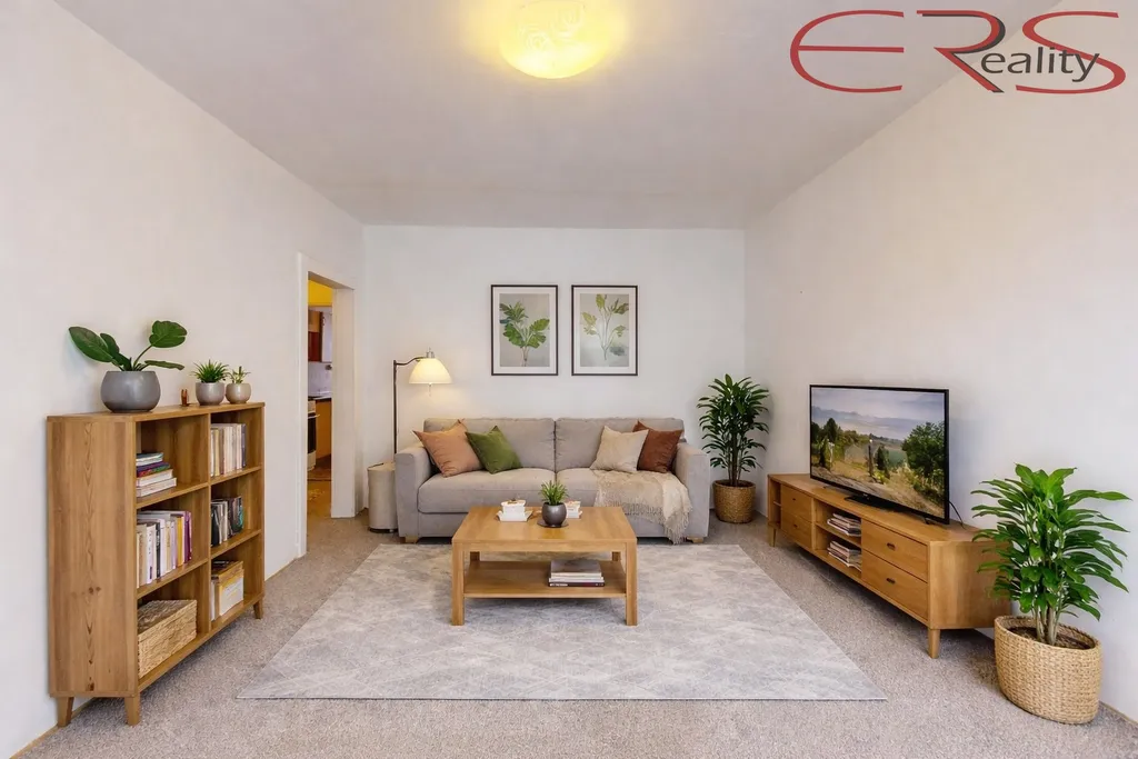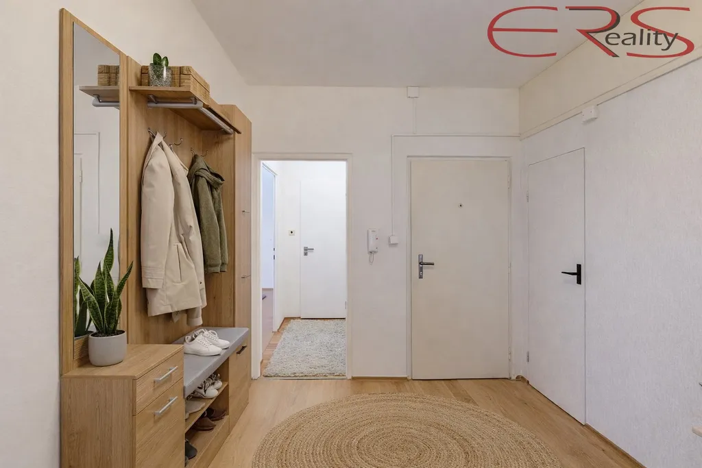 Dispozice je poctivá a dává smysl i lidem, kteří neradi žijí v kuchyni: samostatná kuchyň (cca 11,7 m²) s místem na jídelní stůl, kde se dá opravdu jíst, ne jen hrát „tetris s talíři“. K tomu tři plnohodnotné pokoje. Obývací pokoj má cca 18,5 m² a vede na lodžii, takže ranní káva může probíhat důstojně a ne vestoje u otevřeného okna. Další dva pokoje mají cca 16,3 m² a 15,9 m², takže si vyberete, jestli chcete ložnici, dětský pokoj, pracovnu nebo „pokoj na všechno, co nechci řešit“. Praktický bonus je zázemí, které vám ušetří nervy: koupelna s vanou, samostatné WC, velkorysá předsíň (cca 8,1 m²) a navíc šatna/úložný prostor, protože život není minimalistický, jen se tak občas tváří na Instagramu.