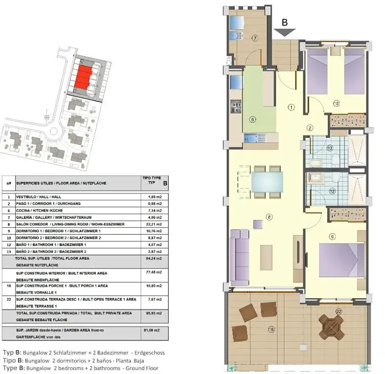 Nabízíme k prodeji dvouložnicový apartmán o celkové ploše 95 m2 v přízemí v moderním projektu Pinars De Murada. V tomto prostorném apartmánu se nacházejí 2 koupelny, kuchyňský kout, rozměrný obývací pokoj 22,2 m2 a dále velká terasa 18 m2.