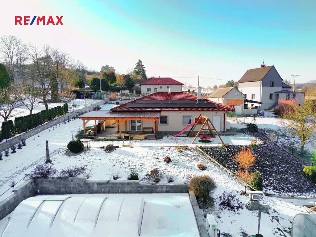 Na pozemku se nachází zateplený zděný dům o dispozici 5+kk, ve velmi dobrém technickém stavu, připravený k okamžitému užívání. Dům je vytápěn tepelným čerpadlem s teplovodním podlahovým topením, ohřev vody zajišťuje bojler 200 l. Energetickou soběstačnost podporuje fotovoltaická elektrárna 10 kWh se záložním zdrojem a baterií 10 kWh, díky čemuž jsou provozní náklady velmi nízké (cca 3 000 Kč měsíčně). Energetická třída B.