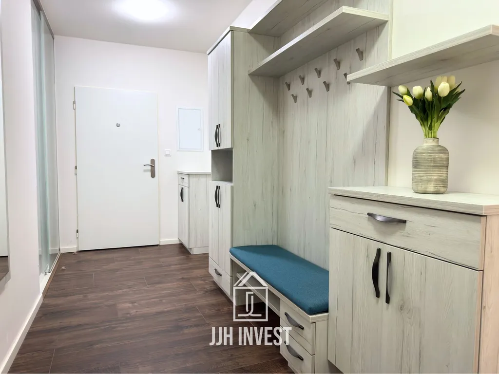 Byt nabízí velké množství úložných prostor po celém interiéru, včetně vestavěných skříní a promyšleného uspořádání. Součástí vybavení je plně vybavená kuchyňská linka, nábytek v obytné části, postel v ložnici a pračka. V celém bytě je podlahové vytápění.