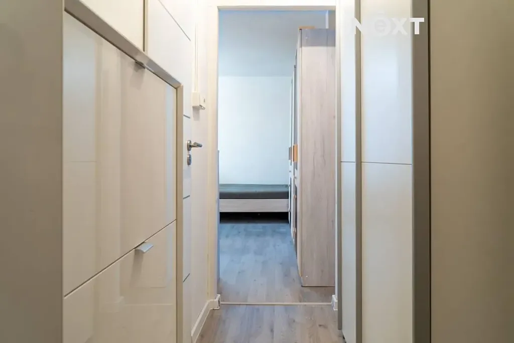 Koupelna je vybavena sprchovým koutem, WC, koupelnovou skříňkou s umyvadlem a elegantní zrcadlovou skříňkou. Předsíň disponuje vestavěnou skříní a botníkem, které poskytují dostatek úložného prostoru a podtrhují čistý, upravený dojem bytu.