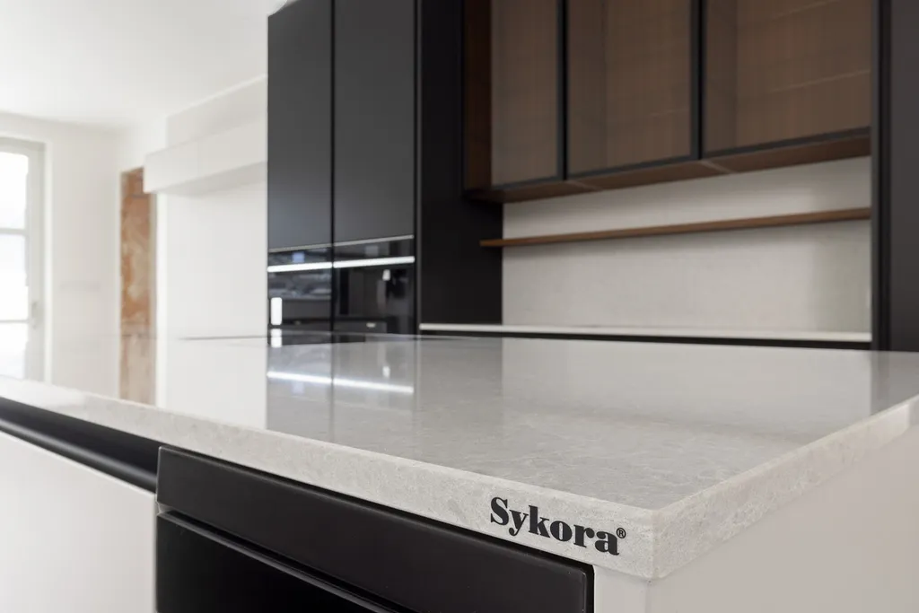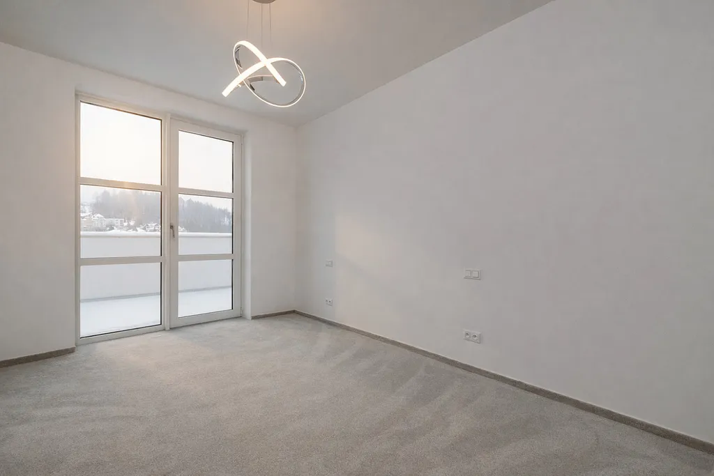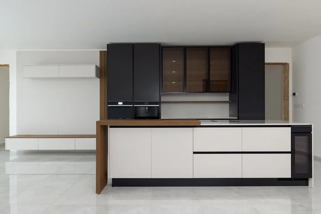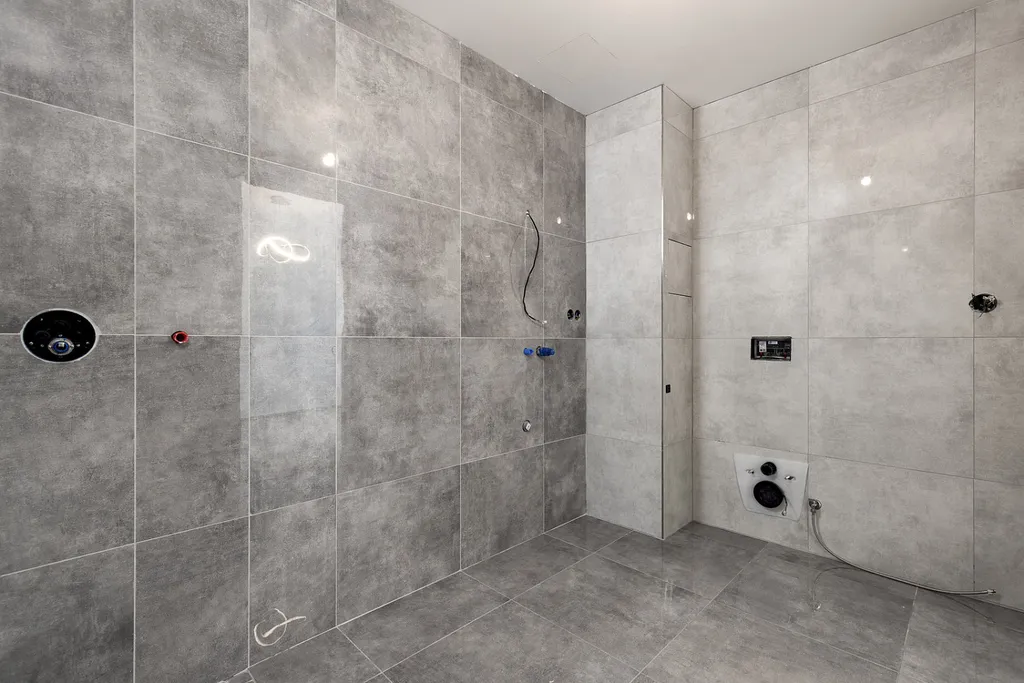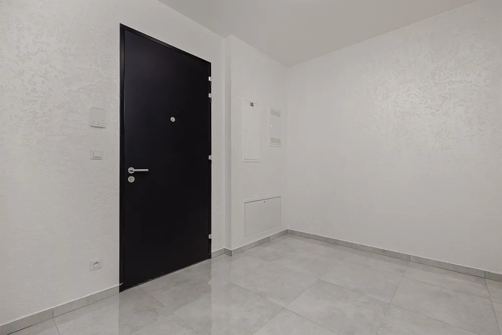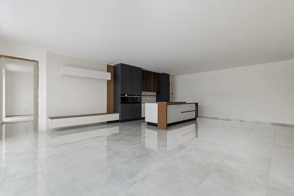 Interiér bytu je připraven jako kvalitní základ pro finální doladění dle osobního vkusu nového majitele. Dokončeny jsou podlahy (kombinace dlažby a koberců), hlavní koupelna v předsíni se sprchovým koutem a toaletou, stejně jako kuchyňská linka SÝKORA na míru včetně vestavných spotřebičů – lednice, trouby, mikrovlnné trouby, varné desky s integrovanou digestoří, vinotéky a kávovaru. Součástí obytného prostoru je také TV stěna na míru. K dokončení zbývají zárubně a dveře ve třech místnostech, koupelna přístupná přímo z ložnice a koncové prvky osvětlení, což dává prostoru možnost finální individualizace.