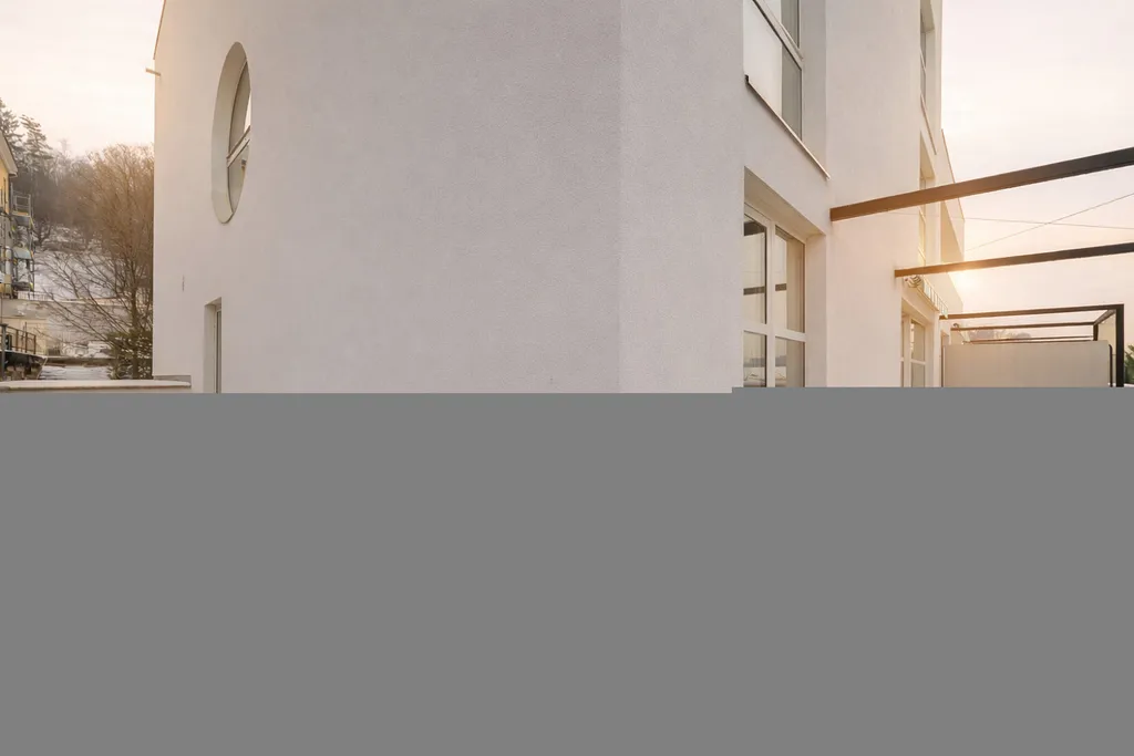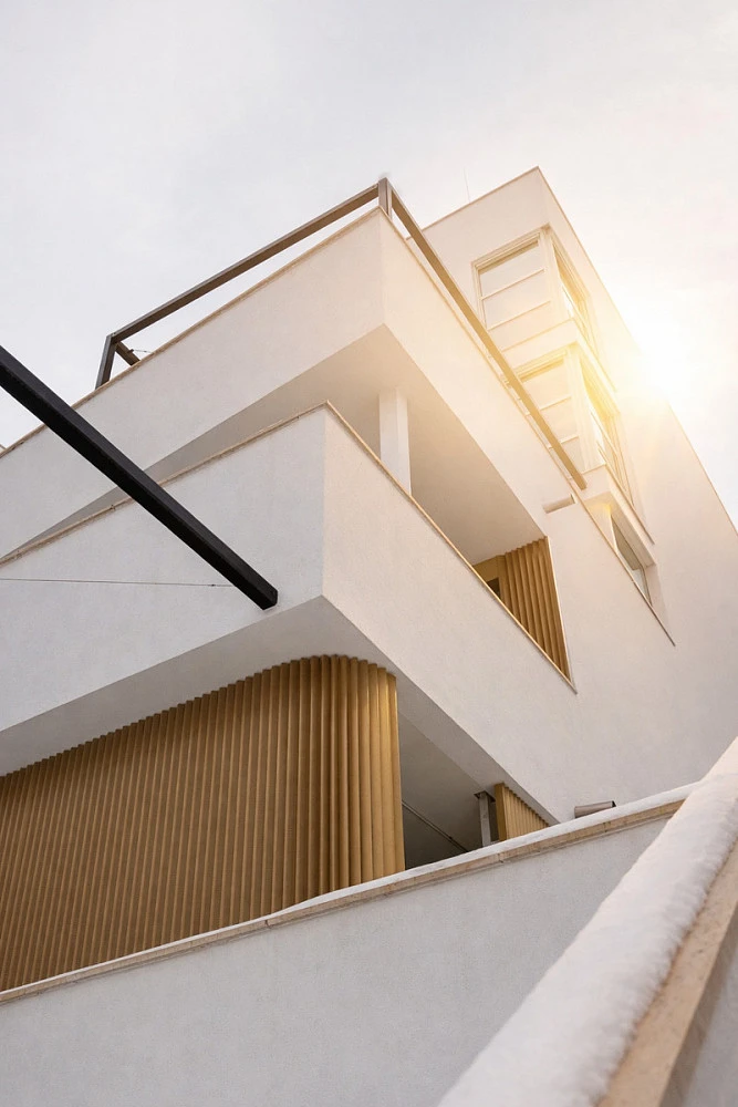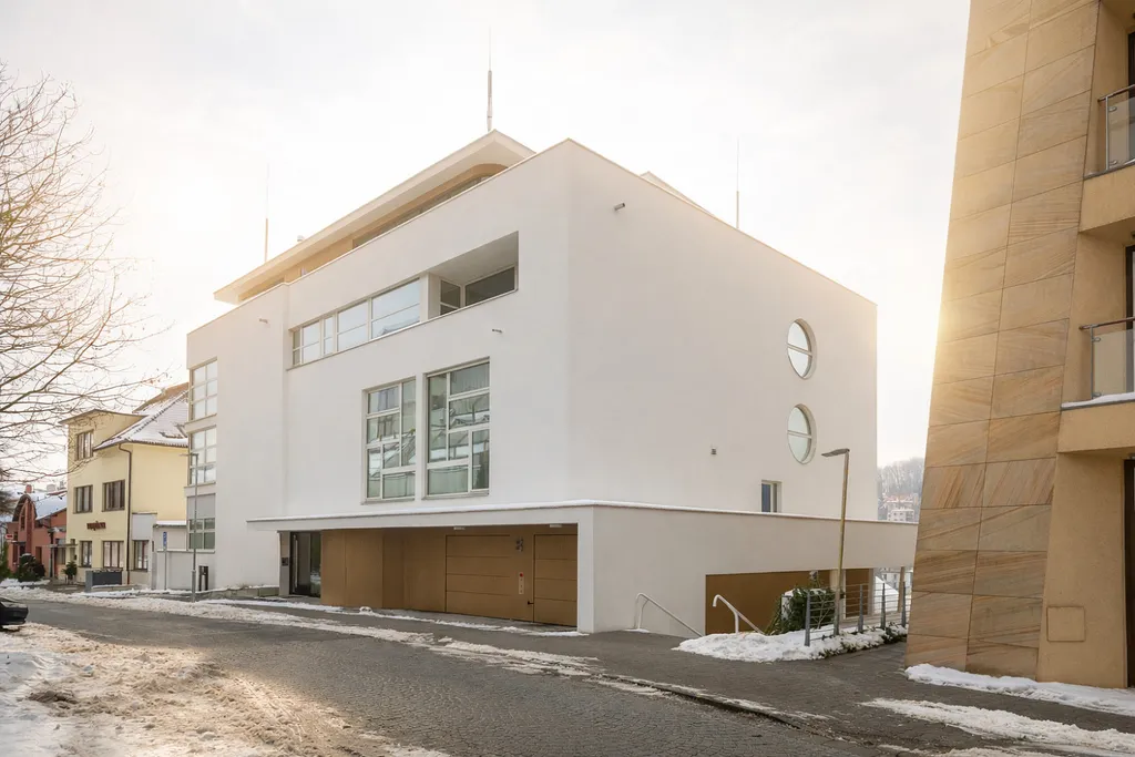 Byt se nachází v rezidenci LA VILLA, projektu dokončeném na jaře 2024, za jehož architektonickým konceptem stojí renomované studio Semela Ateliers. Čistá bílá fasáda, jednoduché linie a promyšlené proporce navazují na tradici bílého funkcionalismu a přirozeně doplňují lázeňský charakter města. Rezidence získala Cenu architektů Zlínského kraje i Cenu veřejnosti v soutěži Realitní projekt roku 2021.