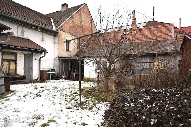 Na dostatečně velké zahradě, která vám nabízí soukromí ať už při zahradničení a nebo prostě k relaxu, najdeme technickou místnost, která byla dříve využita jako garáž. Nicméně parkovací stání může plně naplnit krytý průjezd.