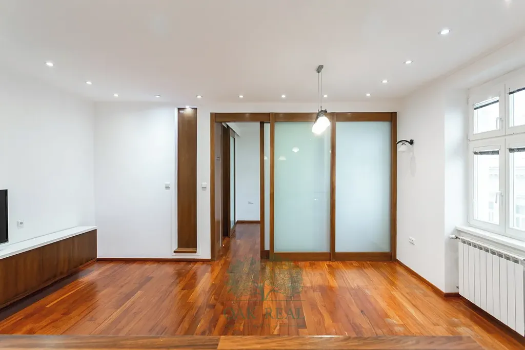 Dominantou bytu je prostorný obývací pokoj propojený s kuchyňským koutem se zabudovanými spotřebiči. Kuchyňský ostrůvek tvoří vestavěná myčka, dřez a barový pult, na druhé straně je vestavěný jídelní stůl. Prosklená stěna s posuvnými dveřmi z mléčného skla odděluje ložnici od obývacího pokoje, zachovává pocit vzdušnosti a světlosti. Ložnice má vestavěnou šatní skříň a vlastní koupelnu vybavenou vanou, prostorným sprchovým koutem, toaletou a pisoárem. Druhý samostatný pokoj má výhled do klidného vnitrobloku a je propojený chodbou s přístupem do menší koupelny pro hosty či pokoj. Koupelna obsahuje velký sprchový kout, umyvadlo a toaletu. Technická místnost poskytuje prostor pro boiler, plynový kotel, pračku, sušičku a další zázemí bytu. Podlahy jsou z exotického afrického dřeva Doussié, okna jsou dřevěná vybavena žaluziemi. Díky své poloze je byt světlý a bez přímého kontaktu s okny sousedů.