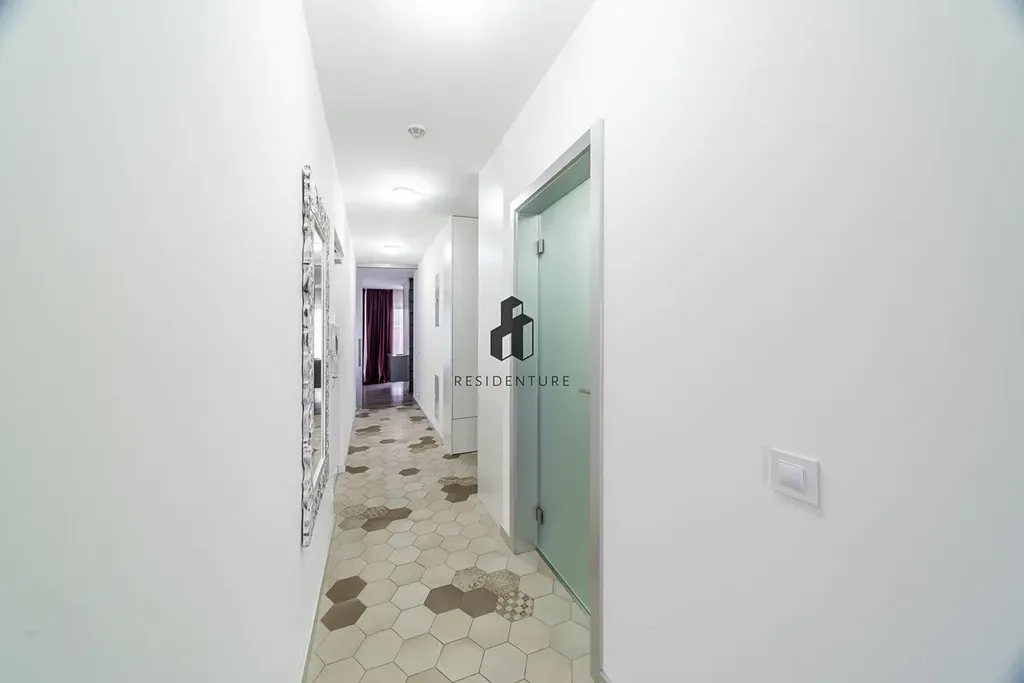 Byt je kompletně vybaven – moderní kuchyňská linka zahrnuje sklokeramickou varnou desku, troubu, myčku, digestoř a vestavěnou lednici. Součástí vybavení je jídelní stůl a sedací souprava.