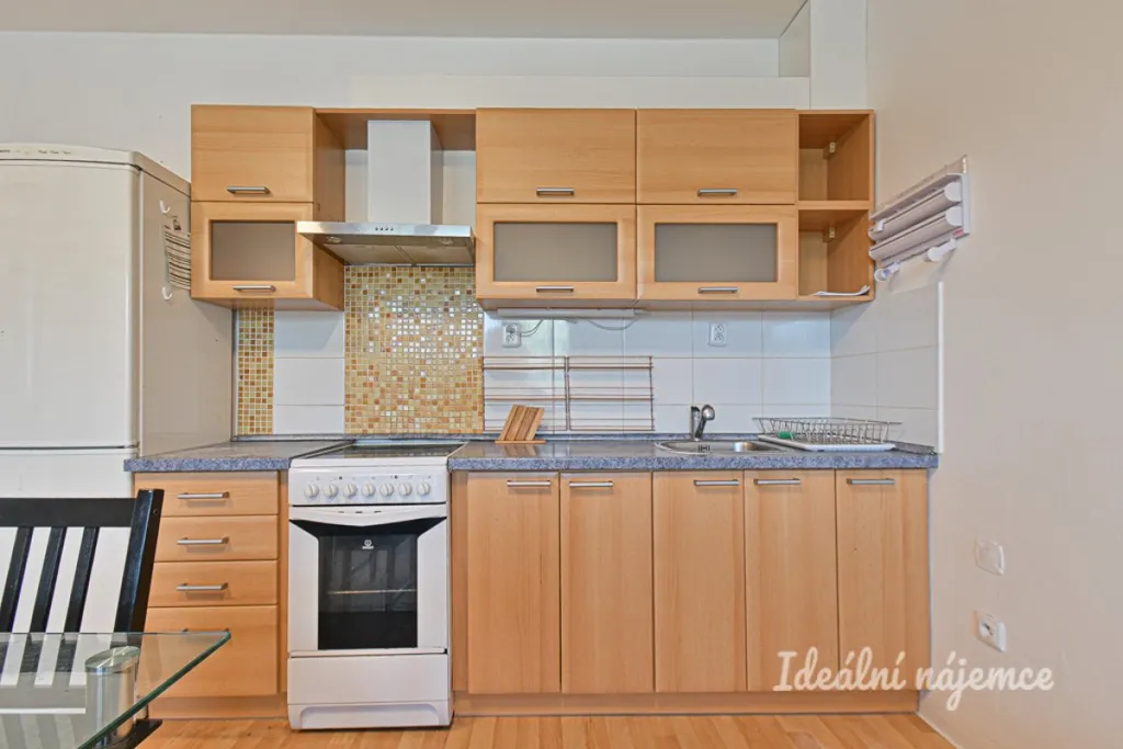 Byt je nabízen částečně vybavený. Kuchyňská linka je osazena sklokeramickou varnou deskou a elektrickou troubou, součástí je také velká lednice s mrazákem.