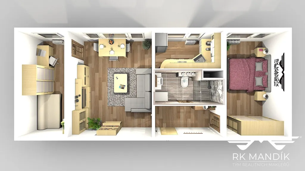 Nemovitost je po zdařilé rekonstrukci a je připravena k okamžitému nastěhování. Dispozičně se byt skládá z obývacího pokoje 17,3 m², dvou samostatných pokojů 12,7 m² a 9,6 m², kuchyně 4,9 m², koupelny s toaletou 3,9 m² a předsíně 4 m².