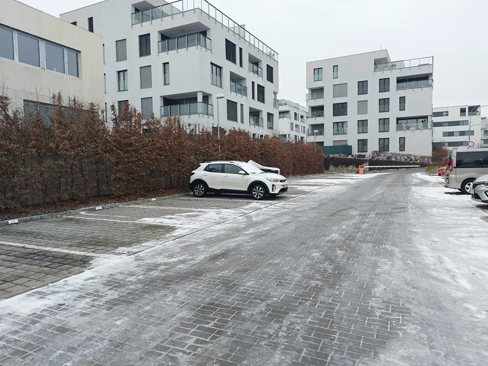 Dispozice: pokoj s kuchyňským koutem 23 m² se vstupem na prostornou lodžii 5 m², samostatný pokoj 12 m² taktéž se vstupem na lodžii, koupelna se sprchovým koutem, společná s WC, s bidetem a přípojkou na pračku, předsíň, k dispozici sklep, kolárna, garážové stání a venkovní stání za závorou.