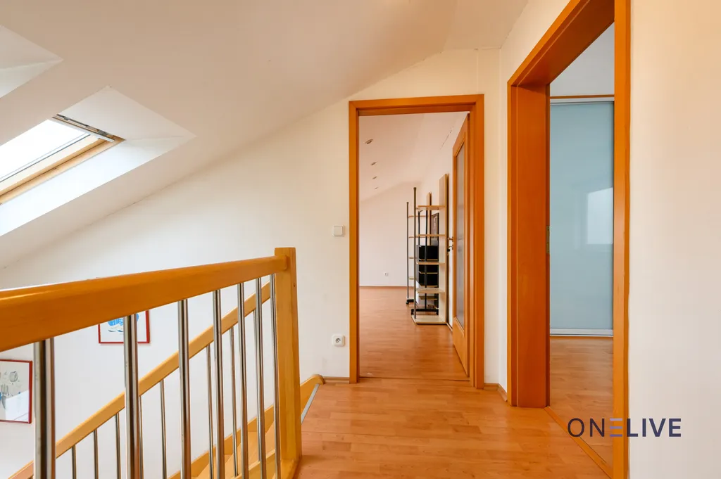 Dispozičně je byt velmi prakticky řešen – vstupní chodba nabízí vestavěné skříně s dostatkem úložného prostoru, dále se zde nachází obývací pokoj, koupelna s vanou a praktickým benefitem bytu je také samostatné WC. Z kuchyně vedou dřevěné schody do horního patra, kde se nacházejí dva další samostatné pokoje. Součástí pronájmu je také sklepní kóje.