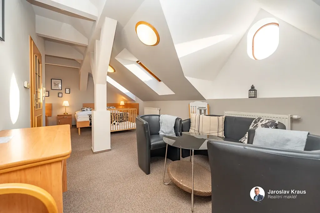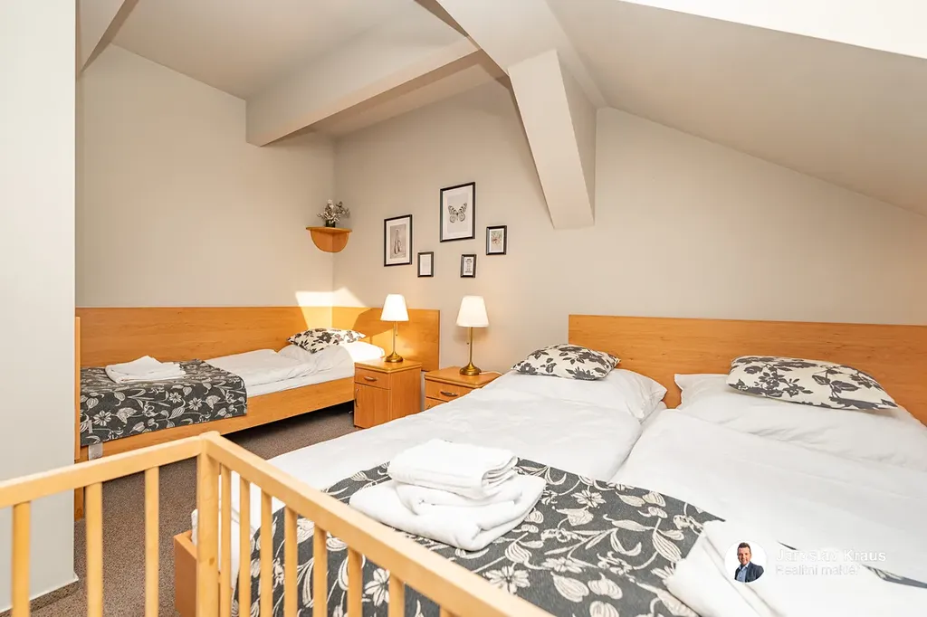 Penzion je rozložen do tří podlaží a nabízí více zdrojů příjmů. V 1. podlaží se nacházejí kancelářské prostory a dlouhodobě prosperující obchod se zázemím, který generuje stabilní výnos nezávislý na ubytovacím provozu. Ve 2. podlaží a půdní vestavbě je umístěno deset vkusně řešených a plně vybavených apartmánů, z nichž jeden slouží k dlouhodobému pronájmu. Každý apartmán má vlastní koupelnu a kuchyňský kout.