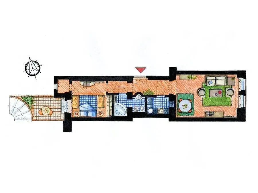 Dispozice bytu nabízí vstupní halu, plně vybavenou kuchyň (sporák, lednice, myčka, pračka, mikrovlnná trouba), obývací pokoj s jídelním prostorem, ložnici s vestavěnými skříněmi, ze které je možný vstup na zahrádku a do technické místnosti. Součástí bytu je i koupelna s rohovou vanou. Podlaha v bytě: parkety a dlažba.