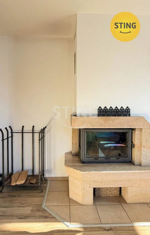 - v obývacím pokoji je krb a vstup na terasu přes francouzské okno