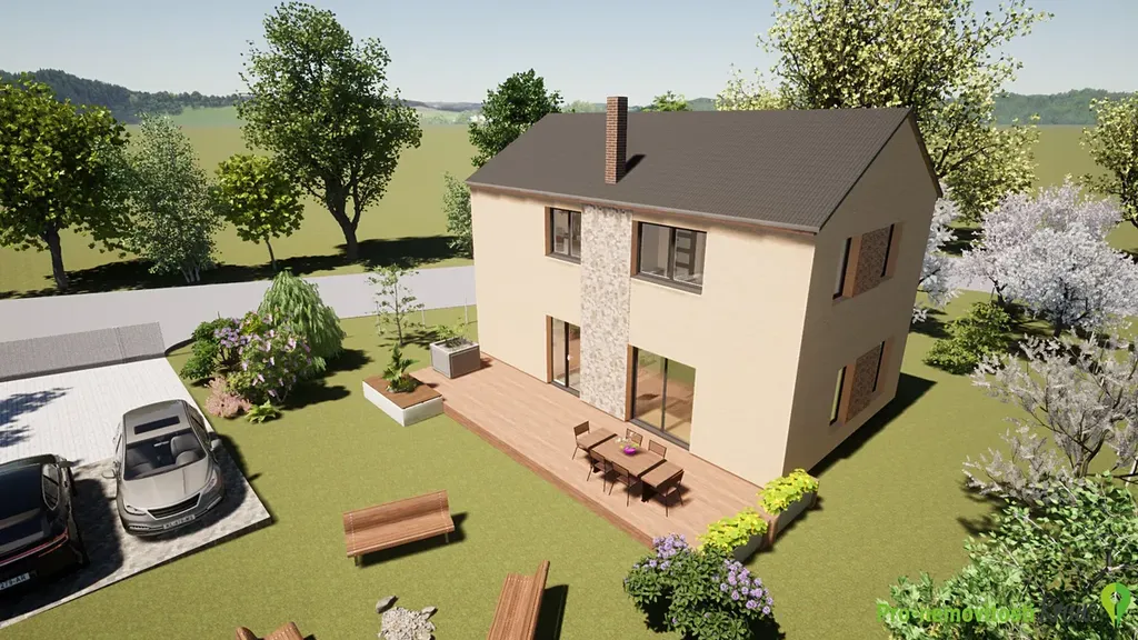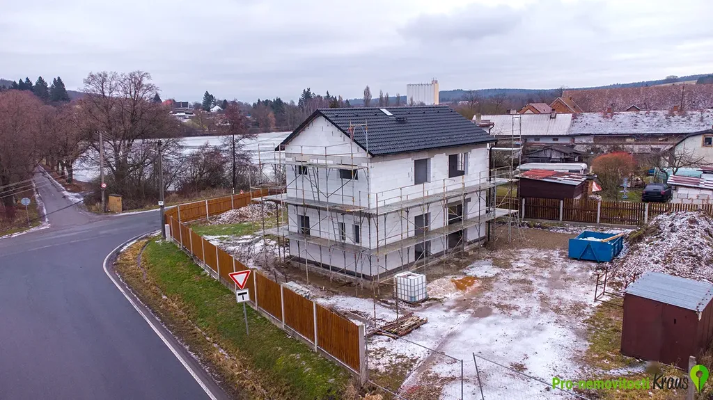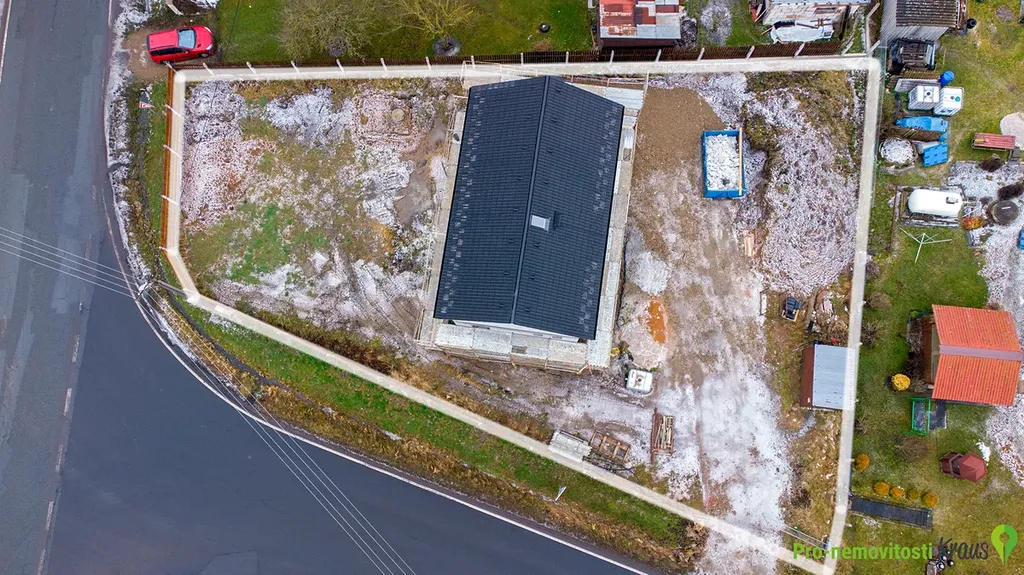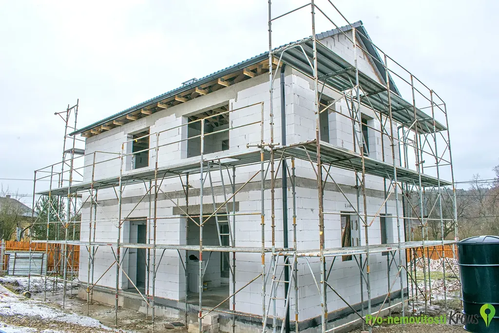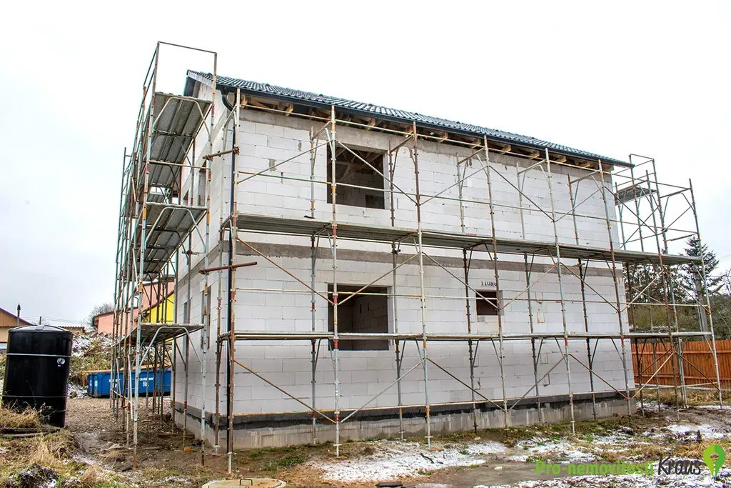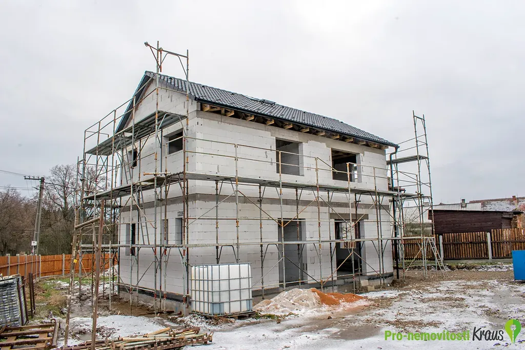 Předmětem prodeje je hrubá zastřešená stavba s osazenými okny a vchodovými dveřmi, dokončenou zateplenou fasádou, uvnitř s hrubými podlahami, vnitřními příčkami, komínovým tělesem a betonovým monolitickým schodištěm. V ceně jsou rovněž přípojky elektřiny a obecního vodovodu, ležaté rozvody kanalizace pro odvod splaškových a dešťových vod, domovní ČOV, zpevněné plochy (zámková dlažba) a oplocení pozemku s vjezdovou bránou. Dům bude do tohoto stadia dokončen na začátku léta 2026.