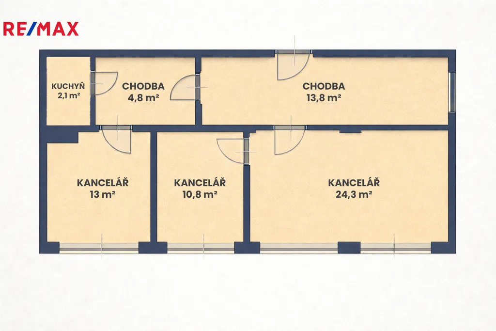 Prostory tvoří 3 kanceláře + kuchyňka a WC s celkovou užitnou plochou 66,7 m²: