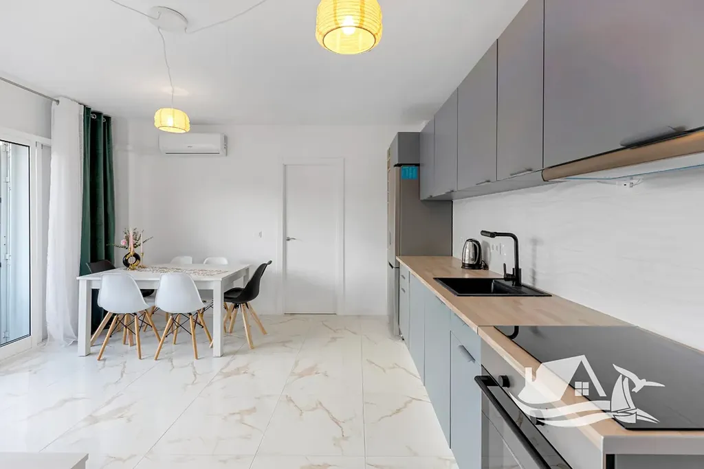 Dispozice apartmánu je praktická a komfortní. Nabízí tři ložnice, jednu koupelnu, samostatné WC pro hosty, velkorysý obývací prostor s jídelnou a otevřenou kuchyní, která přirozeně zapadá do moderního konceptu bydlení. Celková plocha činí 76 m² a nechybí ani terasa o velikosti 5 m² orientovaná na severovýchod, ideální pro klidné ranní posezení s mořským vzduchem.