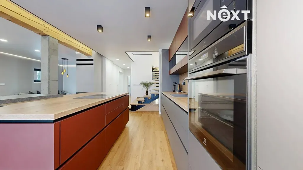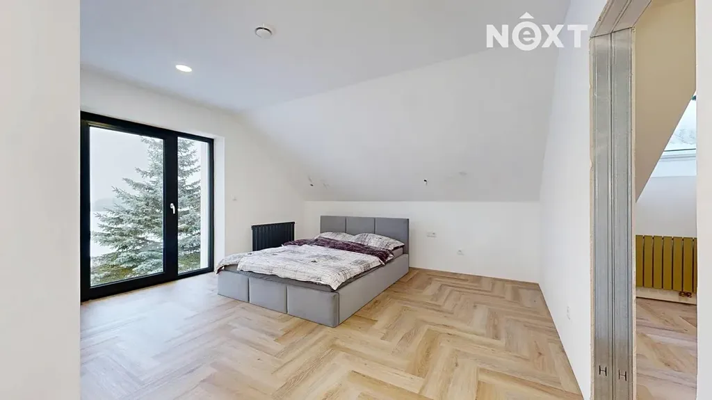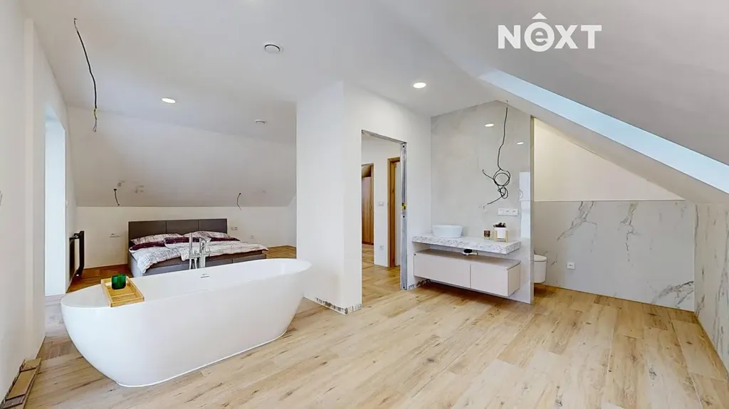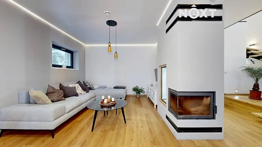 Interiér je vzdušný, vkusný a sladěný do moderního stylu, kde každý detail dává smysl. Dvě podlaží chytře rozdělují denní a noční zónu – v přízemí prostorný obývací pokoj s kuchyní a přímou návazností na budoucí terasu, v patře klid pro ložnice, dětské pokoje či pracovnu. Terasa čeká na dokončení, což je skvělá příležitost dotvořit ji přesně podle vašich představ. Praktickou stránku zajišťuje garáž přímo v domě, takže nákupy v dešti už nebudou drama, také dostatek úložných míst – od šatny po technické zázemí – které ocení každá rodina v domě o dispozici 5+kk. Technicky je dům radost popsat: pasivní standard, trojskla, centrální větrání s rekuperací a vytápění kotlem na pelety drží náklady na provoz na minimu a komfort na maximu. Energetický štítek PENB A dává jistotu, že teplo neuniká, čerstvý vzduch proudí a vy si užíváte zdravé vnitřní klima bez kompromisů. Místnosti jsou světlé, tiché a útulné – ideální na snídani s výhledem do zahrady i večerní odpočinek po práci.