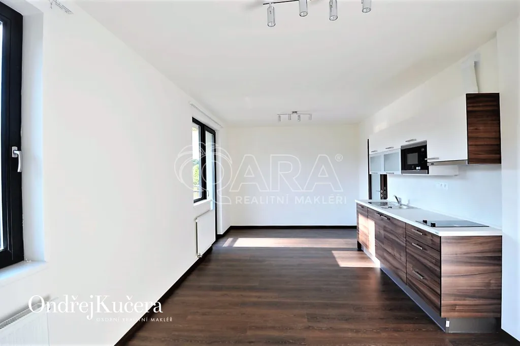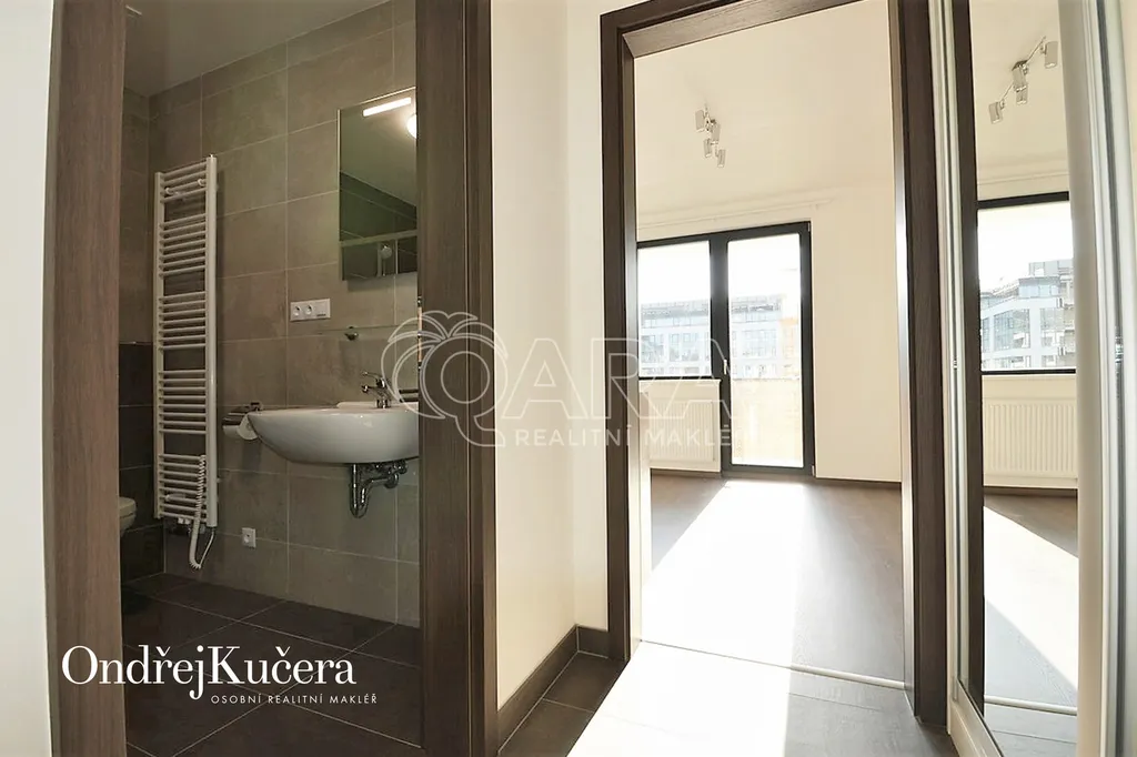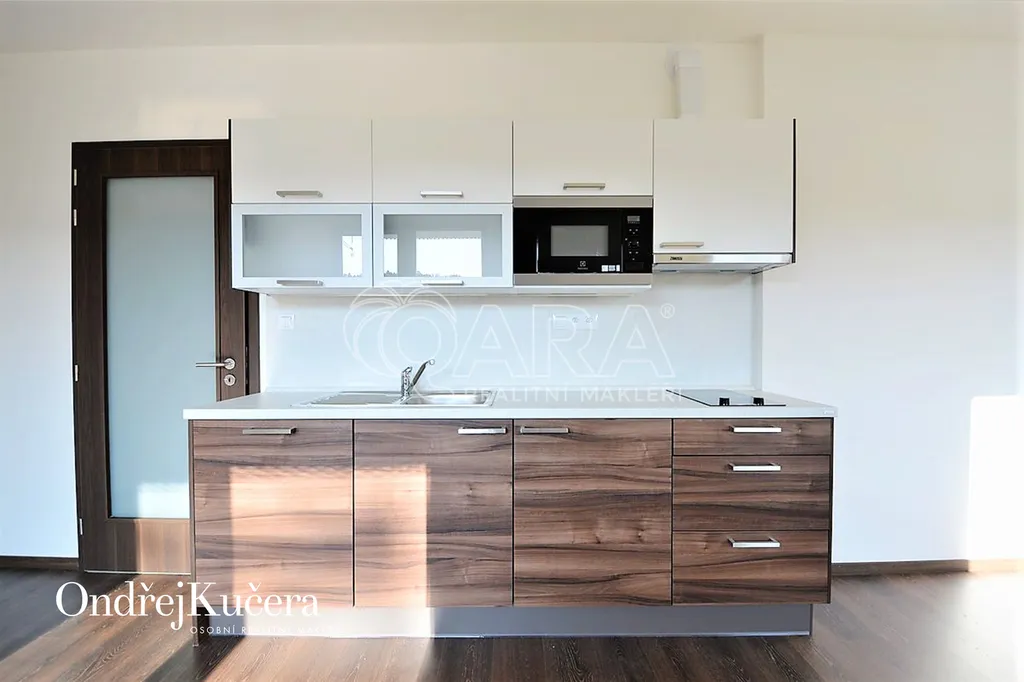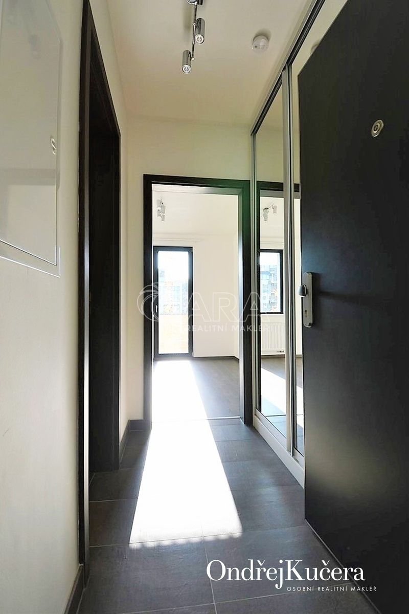 Světlý a komfortní byt dispozičně řešený jako 1+kk s balkonem a s celkovou výměrou 38m2, se nachází ve čtvrtém patře novostavby s výtahem. Byt nabízí samostatný pokoj s kuchyňským koutem a se vstupem na balkon 5m2, orientovaným na západ. V předsíni se nachází velká vestavěná skříň, v koupelně sprchový kout, toaleta a pračka (není na fotografii). V bytě jsou bezpečnostní dveře, plovoucí podlaha, vestavěná kuchyňská linka na míru, zařízená kvalitními spotřebiči, jako sklokeramická deska, odsávací digestoř, lednice s mrazákem, myčka a mikrovlnka. Pro rezidenty domu je ve vnitrobloku soukromá zahrada s posezením.