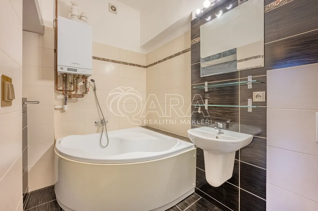 V bytě je plynový kotel, který ovládá topení a ohřev vody.