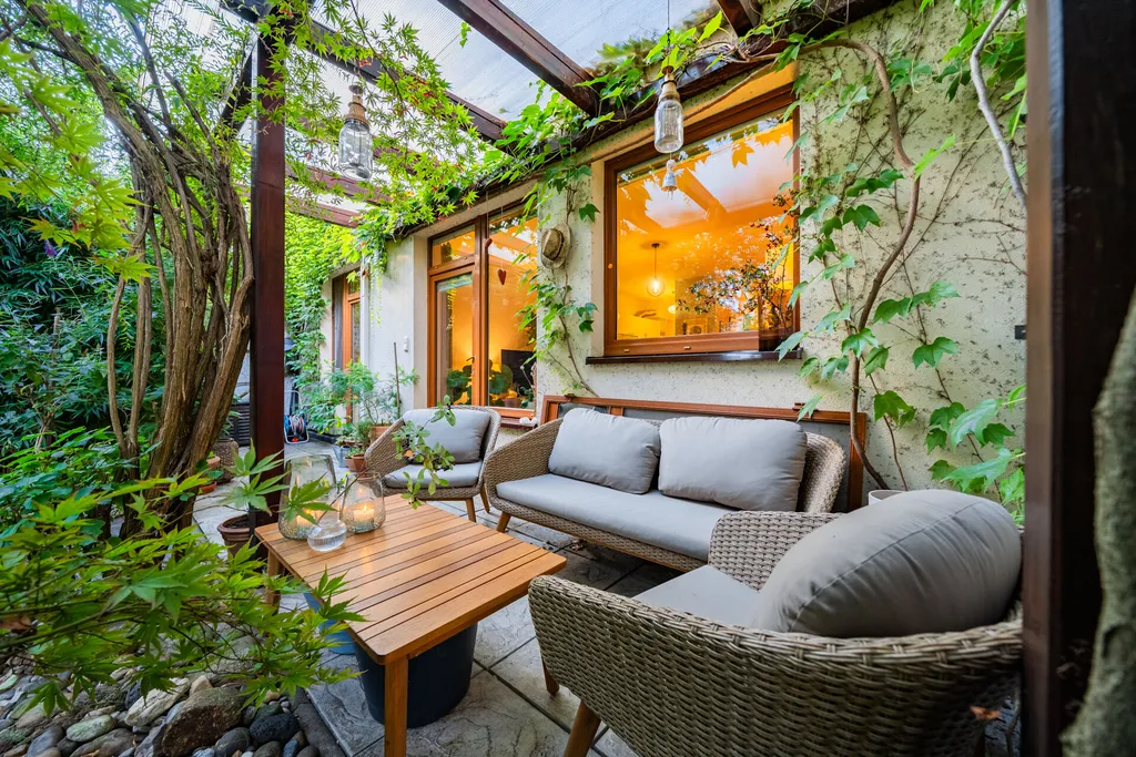 Přízemí bytu tvoří obývací pokoj se vstupem na terasu a dále do zahrady. Terasa je zastřešená a zvětšuje tak užitný prostor bytu. Zahrada je rovinatá se vzrostlými dřevinami, které poskytují nejen pocit, že jste součástí přírody, ale poskytují i velmi příjemné klima v přízemní části bytu. Obývací pokoj je prakticky propojený s jídelnou a kuchyňským koutem. Kuchyně je vybavená kuchyňskou linkou se spotřebiči. Dále je zde prostorná ložnice s vestavnými skříněmi. Z ložnice je také umožněn přístup na terasu. Samozřejmostí je koupelna se sprchovým koutem a toaletou. Velmi příjemný je fakt, že ze zahrady vede branka k zadní přístupové cestě, na kterou se dostanete pohodlně autem, což je velmi praktické v rámci zásobování či stěhování.