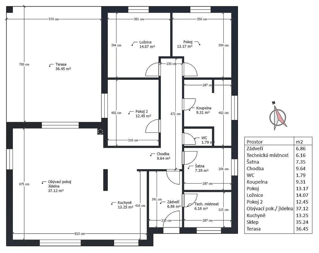 Dispozice domu obsahuje 3 samostatné pokoje, dominantní obývací pokoj (jak bylo uvedeno), technickou místnost, prostornou koupelnu s vanou i sprchovým koutem, samostatné WC a šatnu, ze které může být pracovna. A pro milovníky venkovního posezení jsou zde dvě terasy, jedna zastřešená a jedna nezastřešená obě s krásným výhledem na Pardubice a při dobré viditelnosti i mnohem dále. Díky umístění ve svahu je k dispozici sklep o výměře 35 m2.