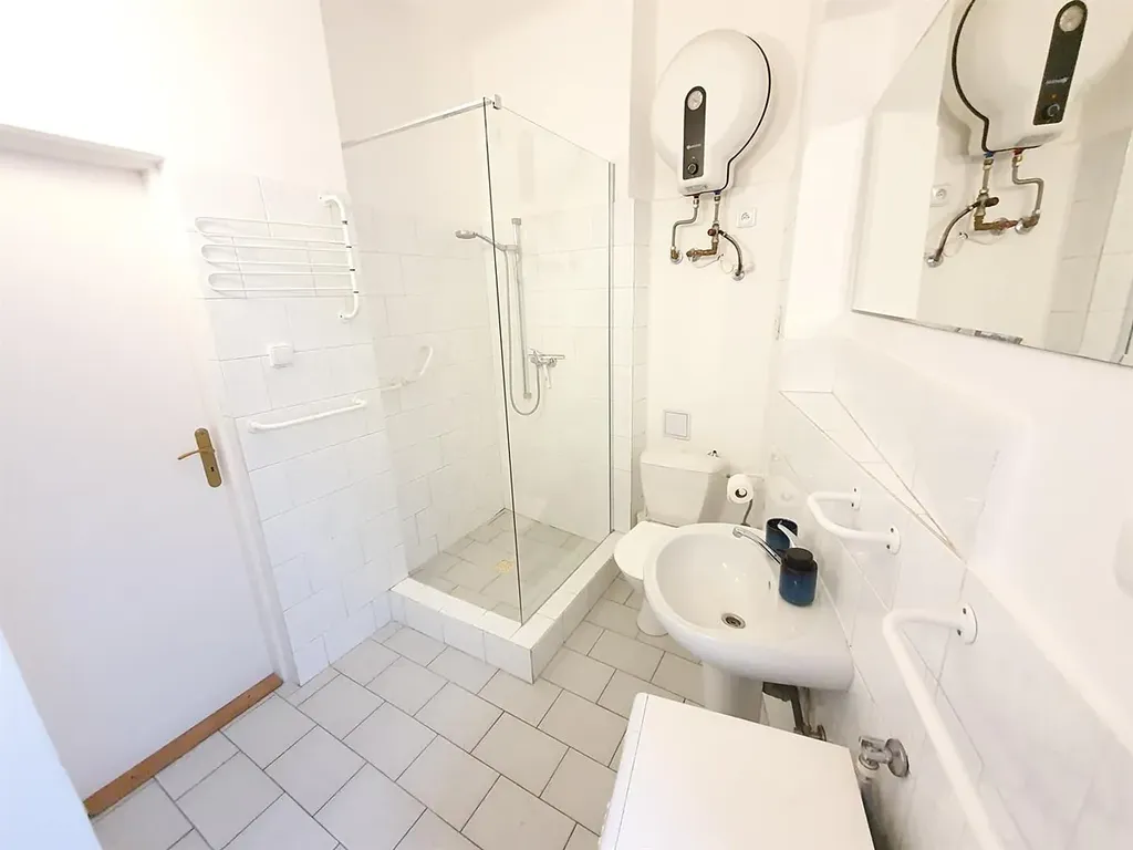 Zařízený: pračka, sporák, lednička, nábytek. Na podlahách dlažba a lino. Koupelna se sprchovým koutem spojená s WC, chodbička. Ústřední topení z domovní kotelny. Tichý a klidný byt v romantické historické lokalitě v centru Prahy u Vltavy. PENB:G