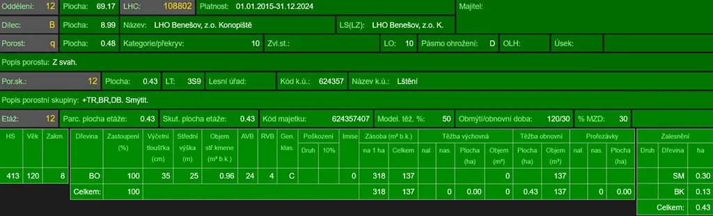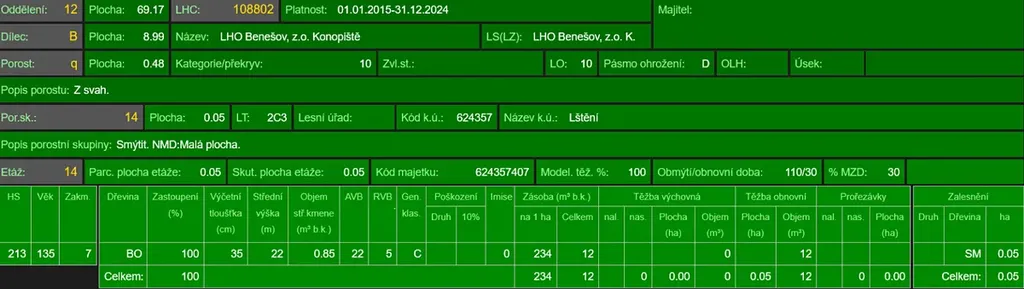 Zastoupení dřevin dle LHO borovice, stáří lesa 130 let.