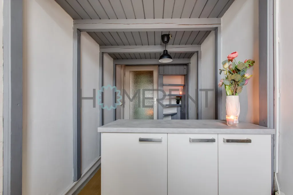 Druhá místnost slouží jako kuchyně s kuchyňským koutem. Nad kuchyní se nachází vyvýšené patro, které nabízí další prostor vhodný například na spaní nebo úložné řešení. Pod tímto patrem je dostatek místa pro jídelní stůl, pracovní kout nebo skříň. Kuchyň je vybavena plynovým sporákem s troubou, dřezem a menší lednicí. V chodbě na stropě je po nadzvednutí podhledu k dispozici další úložný prostor.