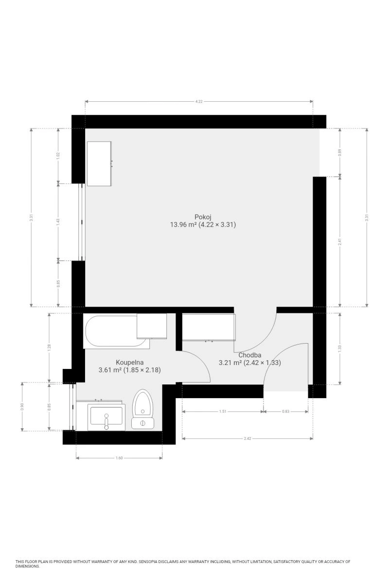 Dispozice 1+kk je chytře řešená a nabízí dostatek prostoru pro pohodlné každodenní fungování. Byt je téměř nevybavený, takže si jej můžete zařídit přesně podle svého vkusu. Součástí bytu je lednice, mikrovlnná trouba, pračka a konstrukce na patrovou postel. Koupelna je zařízena vanou, umyvadlem se skříňkou a toaletou.