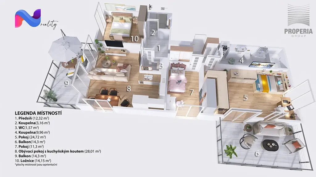 • Příslušenství: Dva balkony (celkem 28,60 m²) a velká sklepní kóje (4,01 m²). Možnost dokoupení garážového stání.