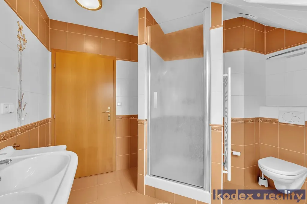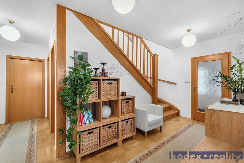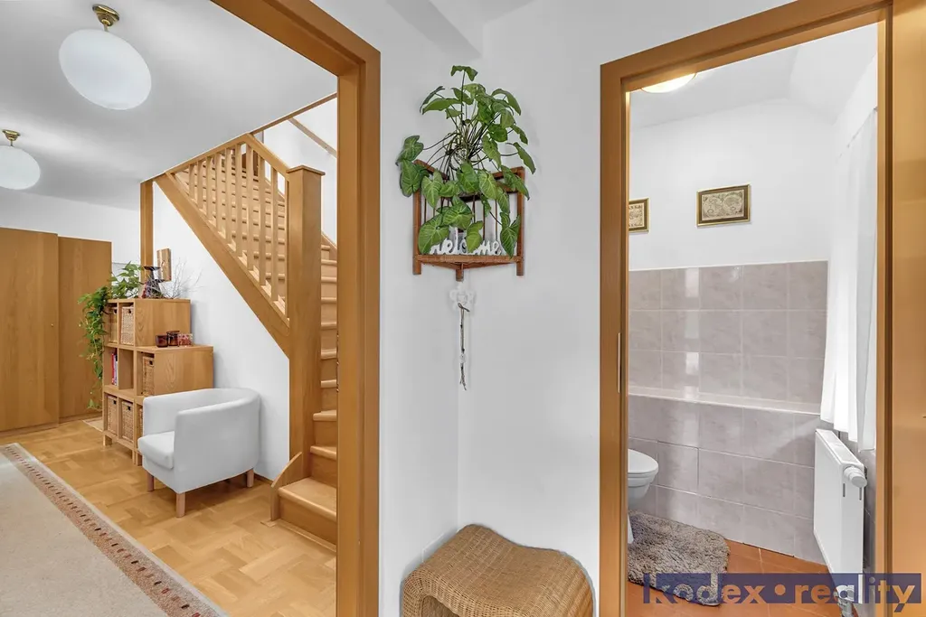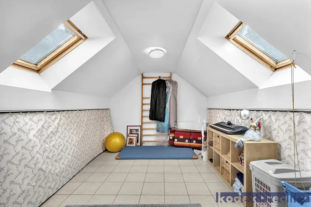 1.NP - chodba se vstupem na úložnou půdu, pokoj pro hosty/pracovna, 2x dětský pokoj, koupelna s WC a velká technická místnost s úložným prostorem, plynovým kotlem a pračkou.