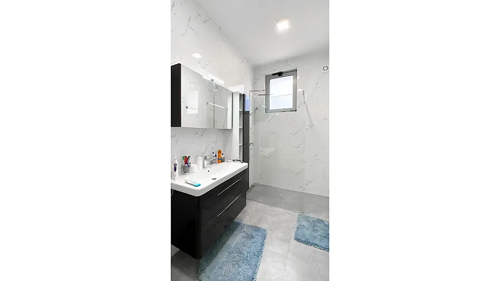 Nemovitost o celkové ploše 338 m² je rozložena do dvou podlaží a nabízí plnohodnotné rodinné bydlení s dostatkem prostoru pro hosty i dlouhodobé pobyty. Přízemí tvoří otevřený obytný prostor propojující obývací pokoj, jídelnu a kuchyni, dále pracovna nebo ložnice pro hosty, dvě koupelny, technická místnost a krytá terasa. Celé přízemí je vybaveno podlahovým vytápěním a díky vysokým stropům dosahujícím až osmi metrů a velkoformátovým francouzským oknům působí interiér mimořádně vzdušně, svěže a plný denního světla. Výhled na moře je zde přirozenou součástí každodenního života.