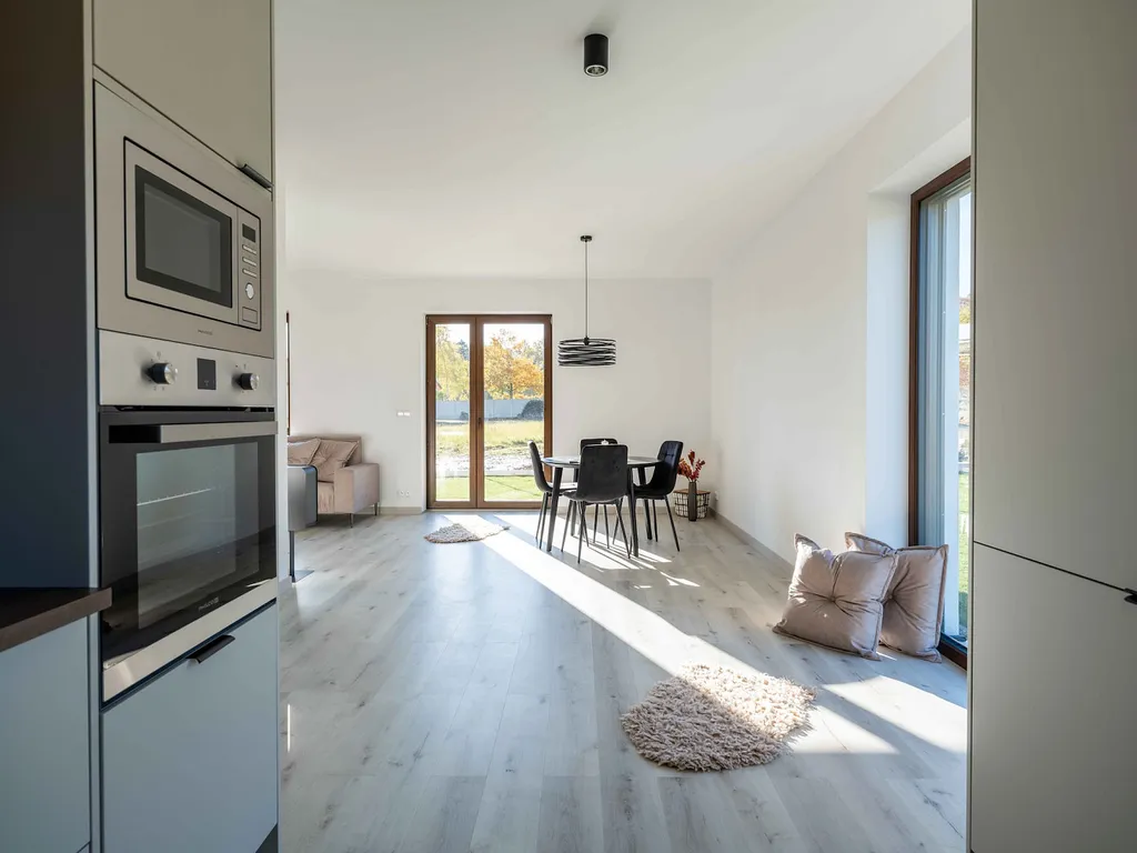 Interiér je světlý, prostorný a laděný v moderním stylu. Kuchyň s jídelním koutem plynule navazuje na obývací prostor, čímž vzniká útulné místo pro setkávání celé rodiny. Vše je ve výborném stavu a připravené k okamžitému nastěhování.