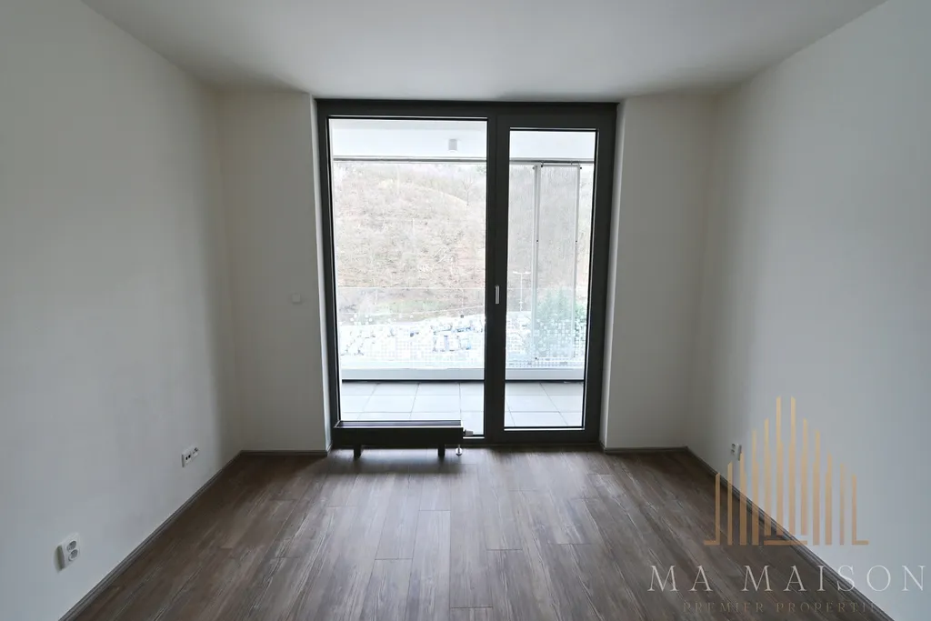 Byt se nachází ve 4. NP novostavby kolaudované na konci roku 2019. Sestává ze vstupní chodby, která propojuje ostatní místnosti, koupelny se sprchovým koutem a toaletou, komorou s přípojkou na pračku, ložnice, obývacího pokoje s plně vybavenou kuchyňskou linkou (elektrická varná deska, trouba, digestoř, mikrovlnná trouba, lednička s mrazničkou a myčka nádobí), pracovny/šatny a z prostorné lodžie s přístupem z ložnice a obývacího pokoje. Bez nábytku.