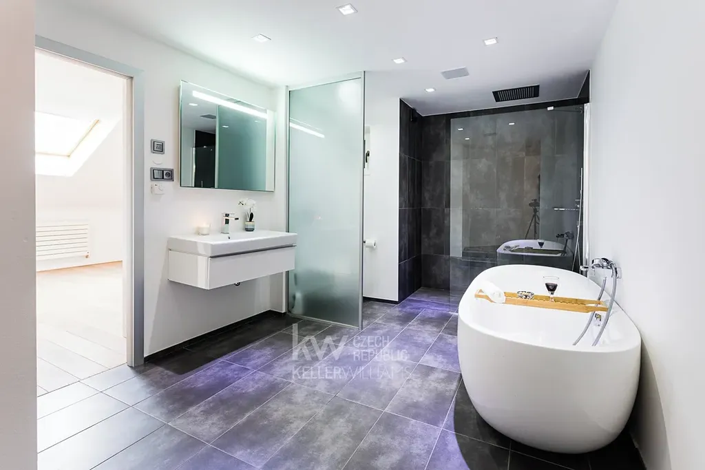 Dominantou bytu je terasa o velikosti 23 m², orientovaná do tichého vnitrobloku – ideální místo pro relaxaci. Menší terasa (cca 8 m²) se nachází o patro výš a nabízí výjimečný panoramatický výhled na Pražský hrad.