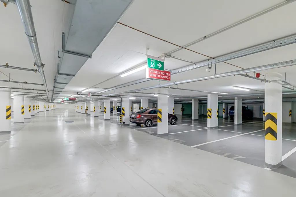 K bytu náleží garážové stání v podzemní garáži a sklep.